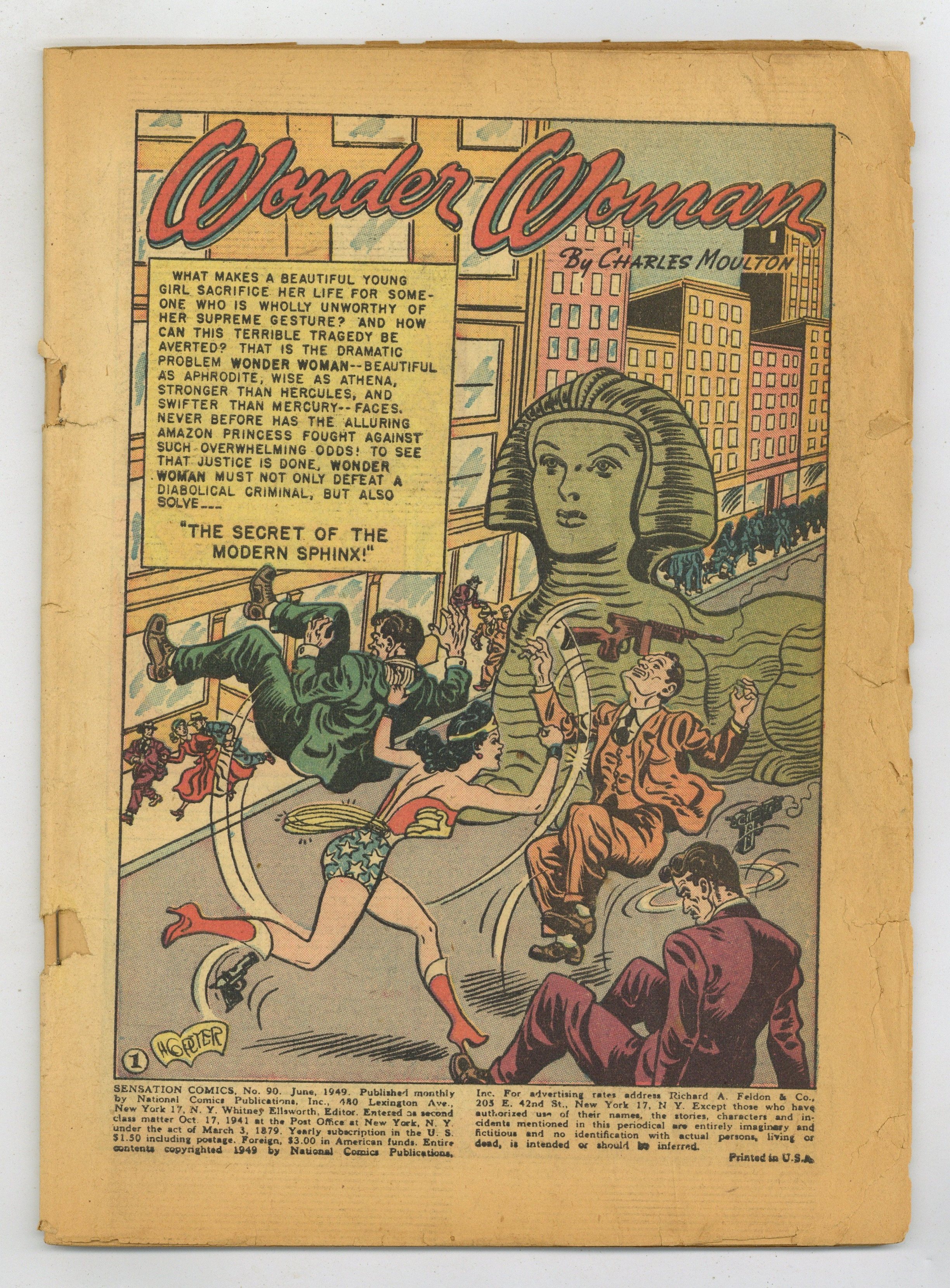 Cover art by Harry G. Peter. The Secret of the Modern Sphinx starring Wonder Woman, script by Robert Kanigher, art by Harry G. Peter. Mary Smith is going to be executed for murder unless someone can turn up and tell her who she really is; or Wonder Woman could use her lasso, but it's missing. The Mystery of Cell 17 starring Wildcat. Chip humor page by Harry Lampert. Willy Nilly story, art by Frank Harry. The House of a Thousand Secrets starring Lady Danger, art by Emil Gershwin. 52 pgs. $0.10. Cover price $0.10. Grade: Coverless explanation of grade Condition: Used (collectible)