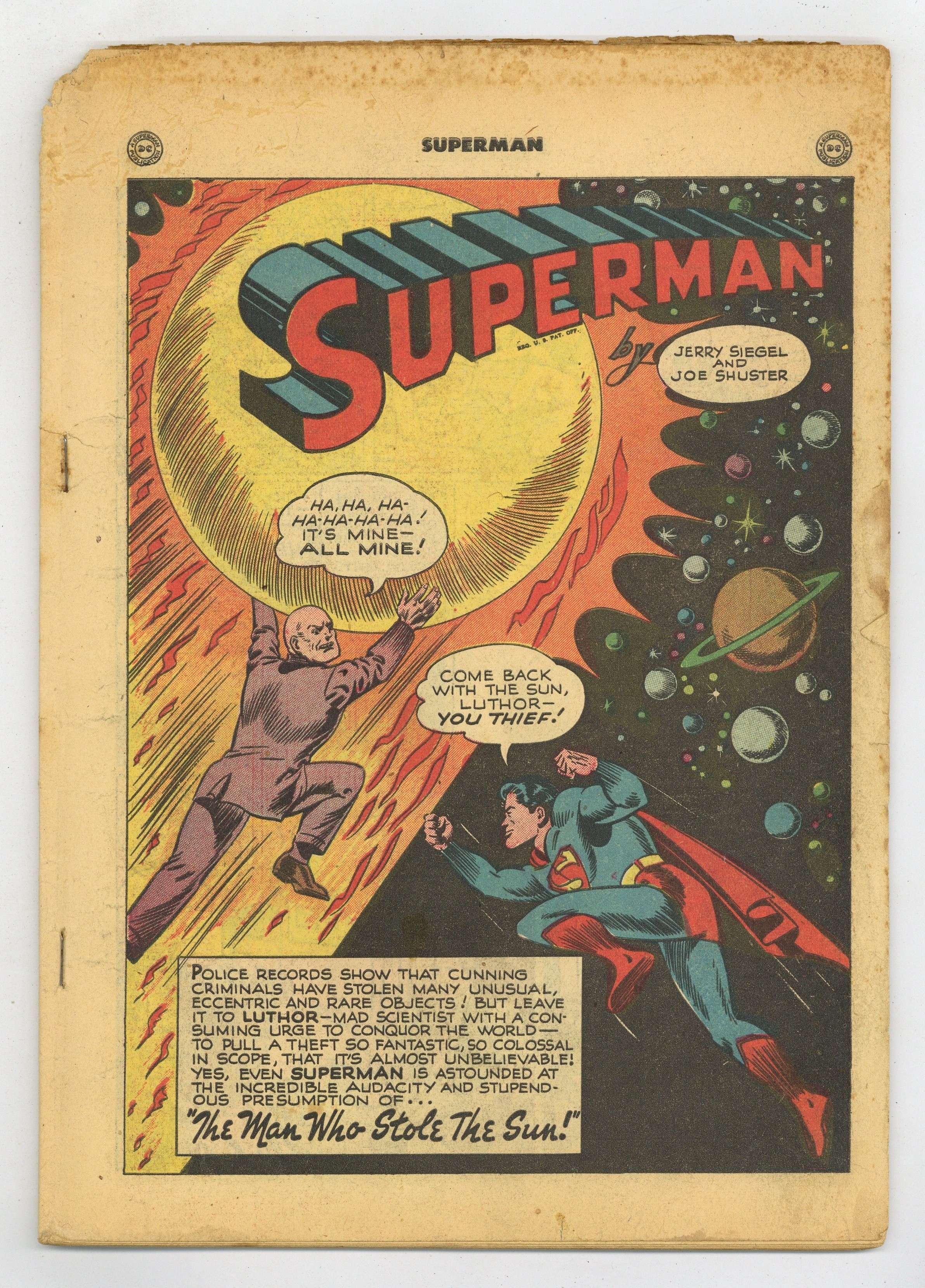 Cover pencils by Wayne Boring. The Man Who Stole the Sun!, script by Jerry Siegel, pencils by John Sikela; Luthor uses a giant space ship to cut off sunlight from the Earth. Autograph, Please!, script by Jerry Siegel, art by John Sikela; When the Daily Planet mounts an autograph contest, Superman helps Johnny Terrill collect signatures from around the globe and across time to give him the confidence to walk again. Flip Flop the Clown humor page by Phil Berube. Comeback of a Clown text story by Tex Blane. The Rarest Secret in the World starring Superman, script by Jerry Siegel, pencils by John Sikela, inks by George Roussos. A Wheaties ad features baseball's George Kurowski (St. Louis Cardinals). 52 Pages, Full Color. Cover price $0.10. Grade: Coverless explanation of grade Condition: Used (collectible)
