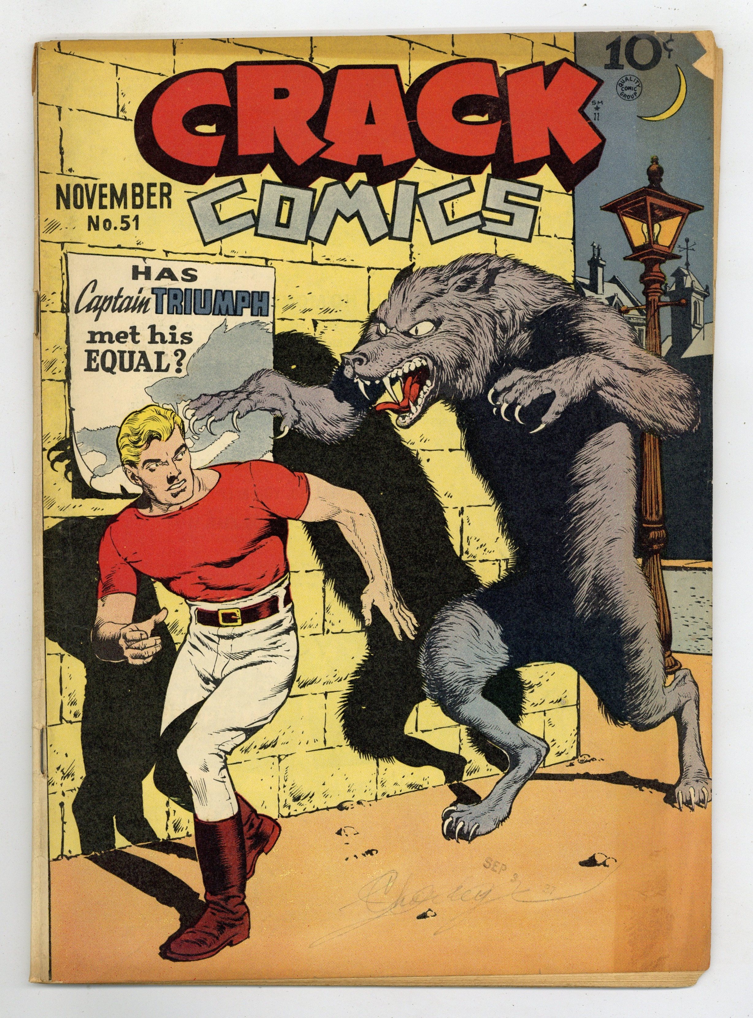 Cover art by Reed Crandall. The Werewolf War, art by Reed Crandall; In a strange town, Kim is kidnapped by a man named Raffrey, who, in reality, is a werewolf; Captain Triumph shows no remorse for the evil creature by delivering a fatal blow to it, even after he had reverted back into human form. The Shrunken Crooks starring Inkie, script and art by Al Stahl. Trouble! starring Hack O'Hara. The Substitute Strips starring Pen Miller, script and art by Klaus Nordling. The Magic Tree starring Floogy the Fiji. Insurance, Injuries, and Marriage Prospects starring Beezy, script and art by Bernard Dibble. 52 pgs. $0.10. Cover price $0.10. Grade: VG- 3.5 explanation of grade Condition: Used (collectible)