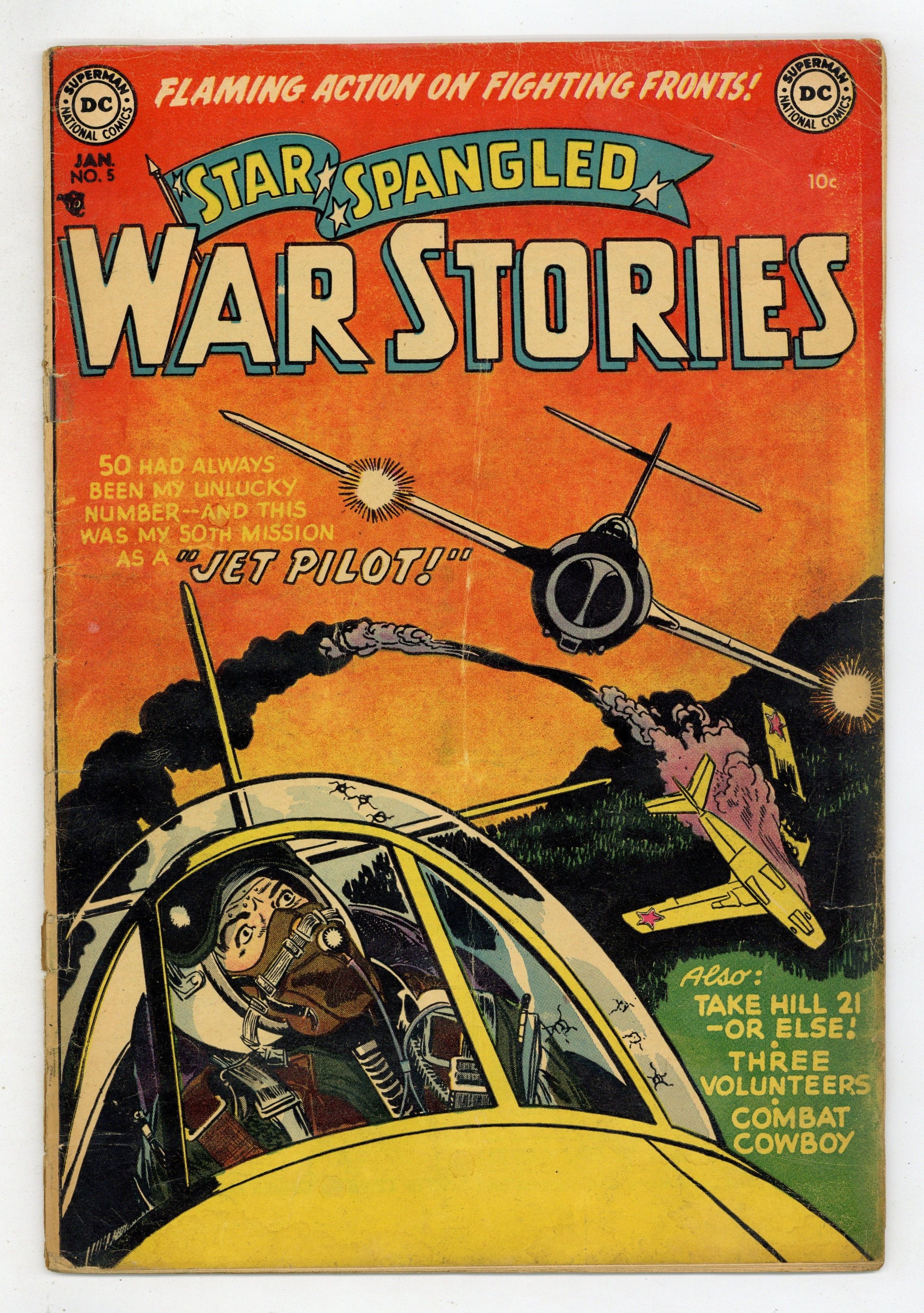 Cover art by Leonard Starr. Jet Pilot, art by Leonard Starr. Take Hill 21--Or Else, pencils by Curt Swan, inks by Stan Kaye. Combat Cowboy, pencils by Jerry Grandenetti, inks by Ray Burnley. Three Volunteers humor story, pencils by Curt Swan, inks by Stan Kaye. Capt. Jason Mallory text story by Jack Miller. 36 Pages, Full Color. Cover price $0.10. Grade: GD- 1.8 explanation of grade Condition: Used (collectible)