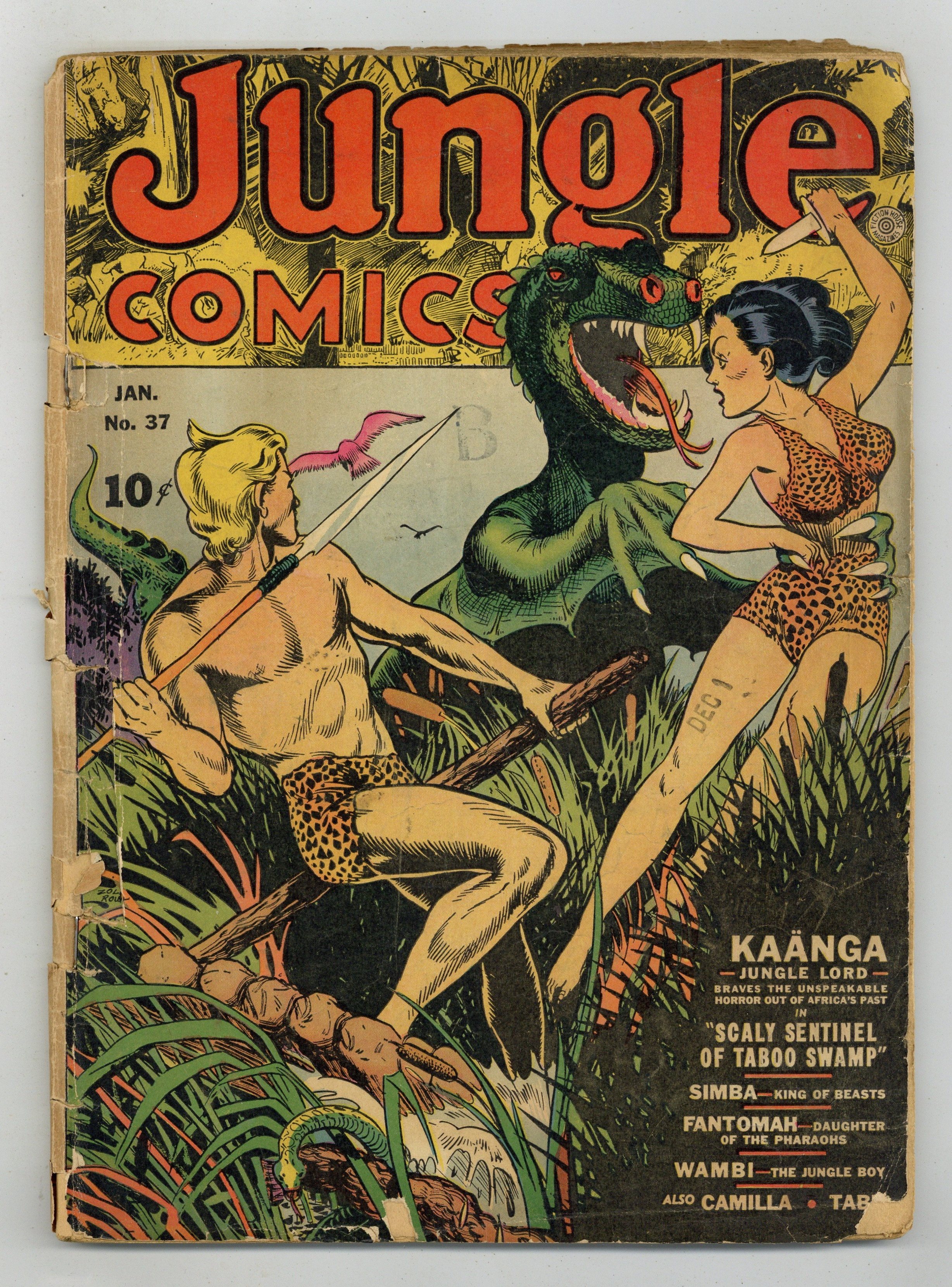 Cover art by Dan Zolnerowich. "Scaly Sentinel of Taboo Swamp," art by George Tuska; A gang of criminals believe that a scientist can lead them to a giant, solid gold statue; KaƤnga pursues them into the Voodoo Swamp where they all learn that the idol is a living dinosaur. Untitled story, art by George Appel; An Indian rajah comes to Khefra in order to steal the ancient Black Diamonds of Kaa. Untitled story, art by Saul Rosen; Ivory hunters penetrate deep into Tabu's jungle where they encounter a tribe of mute men who kidnap Steve, the safari leader; Tabu learns that Steve had visited the tribe many years before and, after killing their king, had ordered the men's tongues cut out. "Blood Moon over Bandiagara" text story. Untitled story; Counterfeiters swindle Andy but lose their counterfeiting plates in the process. Untitled story, art by Henry Kiefer; An unscrupulous Arab convinces a native village that a new lava formation is a god and orders them to bring him treasure. Untitled story, art by George Tuska; A rogue bull elephant makes trouble for the elephant herd before he is driven away by Simba and a monkey. Untitled story, art by Nick Cardy (as N. Viscardi); In order to prevent a leopard cult from driving a tribe off their land, Camilla must select a jungle animal to battle a leopard; She chooses a water buffalo and the buffalo is triumphant. 68 pgs., full color. Cover price $0.10. Grade: GD 2.0 explanation of grade Condition: Used (collectible)
