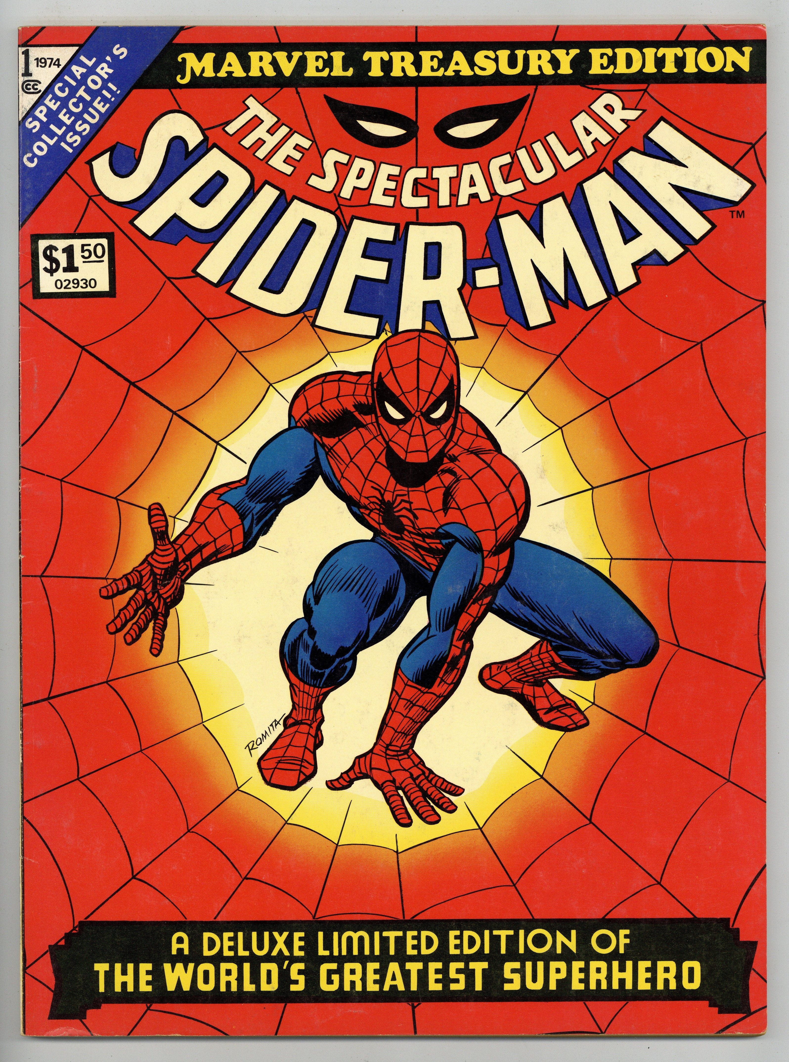 Starts Feb 2 Marvel Treasury Edition (1974) #1 features the Spectacular Spider-Man. Special introduction by Stan Lee. This issue features "The Green Goblin" (Reprints 1st app. of GG) by Stan Lee and Steve Ditko, "Spider-Man Tackles the Torch" (Reprints Strange Tales Annual #2) by Stan Lee and Jack Kirby, "The Birth of a Super-Hero" (Reprints Amazing Spider-Man #42) by Stan Lee and John Romita, "The Reprehensible Riddle of The Sorcerer" (Reprints Marvel Super Heroes #14) Story by Stan Lee and Ross Andru, and finally "And Death Shall Come" (Reprints Amazing Spider-Man #90) by Stan Lee and Gil Kane. Features the villainy of the Green Goblin, the Enforcers, Rhino, and Dr. Octopus. Guest-starring the Incredible Hulk, Fantastic Four, and John Jameson. Also included is 2-page spread from the Daily Bugle and a pin-up featuring Spider-Man, Thor, Hulk, Thing, Hercules, and the Savage Sub-Mariner. 94 pages. Cover price $1.50. Grade: VG+ 4.5 explanation of grade Condition: Used (collectible)