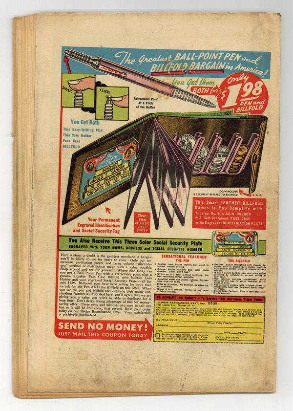 Stories and art by Henry Kiefer and others. Violent, offbeat pre-Code crime comics from D.S. Publishing Company. These early issues featured stories inspired by true crimes, such as the story of legendary Old West bank robber "Western George" Leslie. In the 1820s, two men make a business of selling corpses to medical schools, even if they have to kill them themselves. This story was based on the Burke and Hare murders, and possibly on an earlier story in issue #43 of Crime Does Not Pay (1942). James Hall confesses that he uses hitchhiking as a tool for murder, earning the name The Hitch-hike Killer. "Make It A Million" Leslie; Corpses - Cash and Carry; The Ledgend (sic) of the Lone Wolf; Death Thumbs a Ride; Inside Witness; Entry in a Diary; Il Diavolo. 52 pages, Full Color. Cover price $0.10. Grade: PR 0.5 explanation of grade Condition: Used (collectible)