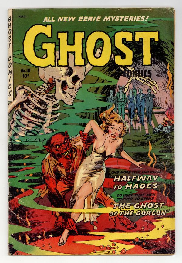 Cover art by Maurice Whitman. Ghost of the Gorgon, art by John Belcastro [as "Johnny Bell"]; During an earthquake relief effort a mythical Medusa creature is released on a Greek island; After a first killing spree the island is evacuated by ship. The Ghost of Doctor Renick, art by Bill Benulis; Having lost his wife on the operating table, Doctor Renick loses faith in his abilities. Halfway to Hades, art by A. Albert; Two students stumble upon the haunted Halfway House where gangsters used to meet and mingle. The Strange Case of the Absent Floor; Dr. Drew investigates the Wainwright building wherein the elevator boy found a non-existent 13th floor. 36 pgs. $0.10. Cover price $0.10. Grade: FR 1.0 explanation of grade Condition: Used (collectible)