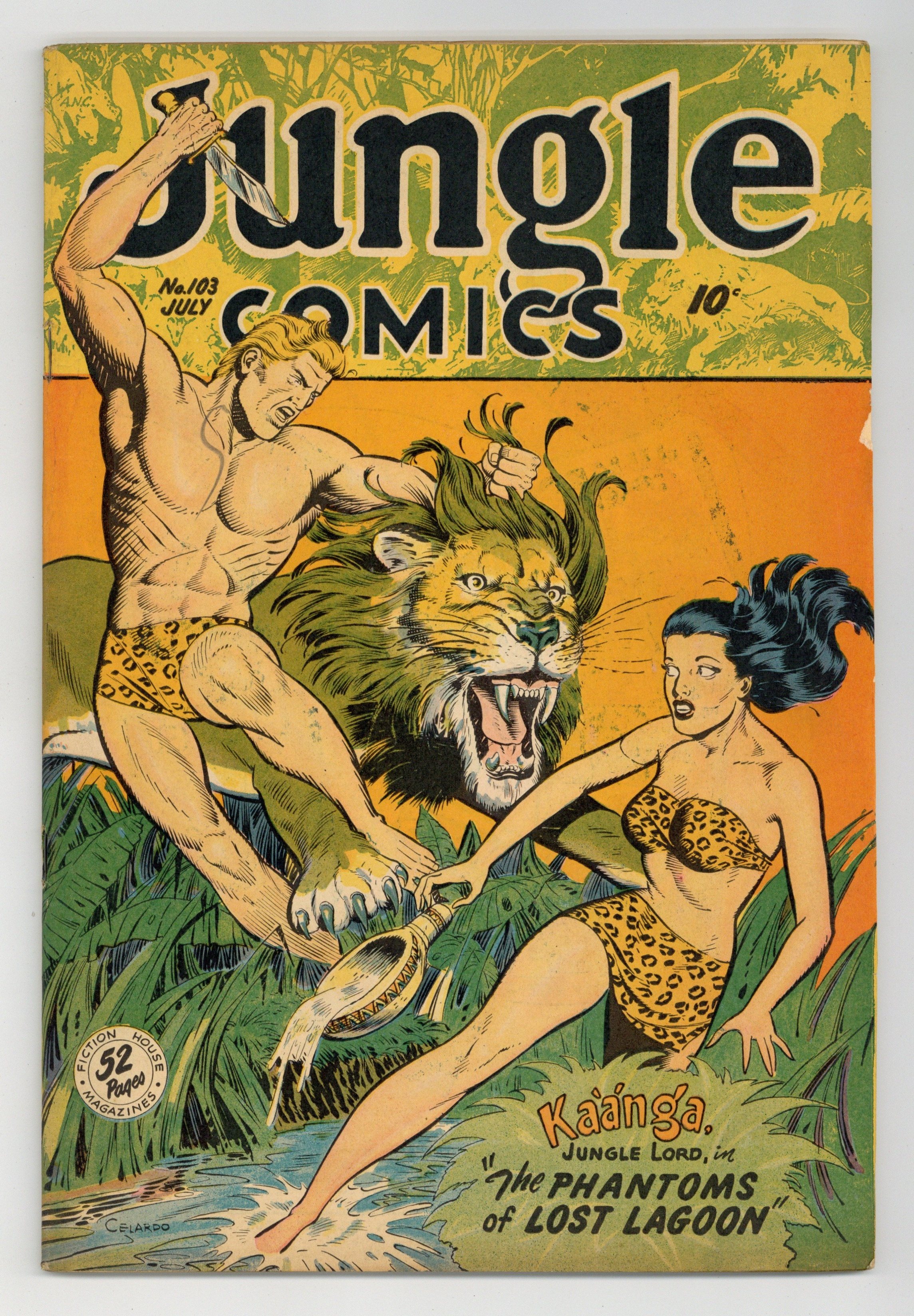 Cover art by John Celardo. "The Phantoms of Lost Lagoon," art by John Celardo; Treasure hunters seek the ship of the Emperor Khan; Kaänga locates the ship but the hunters believe that there is no treasure on board; One of the hunters is killed by a rhinoceros and Kaänga kills the other. Untitled story, art by August Froehlich; A hunting cheetah escapes from his masters and is befriended by Simba; The two of them free the animals captured by the cheetah's masters. David Livingstone biography, art by George Evans. Untitled story, art by Charles Sultan; A young man infiltrates the lancers and frees his brother from the fort jail; The brother, Unganda Bill, and his accomplice, T'Gara, go on an ivory raid but are captured by Terry and the lancers with help from Bill's brother. Untitled story, art by Frank Doyle; The Scepter of Guru, a sacred object, is stolen from a village in Wambi's jungle and winds up with Ogg; The villagers seize Ogg and prepare to sacrifice him for profaning their sacred scepter. Untitled story, art by Maurice Whitman; Priestess Zotara rigs King N'Mongo's annual kingship ritual to cause N'Mongo's death and her own ascension to the throne. Tabu re-enacts the ritual in the Land of Mists--a nebulous after-life--and demonstrates Zotara's criminal acts. Jungle Facts; Brief natural histories of several jungle cats. Untitled story, pencils by Matt Baker; When mine owner's daughter Jane Bronson learns that her father's overseers are using slave labor in her father's mines, she hurries to tell him; However, she accidentally stumbles into a trap set by Camilla for hyenas. 52 pgs., full color. Cover price $0.10. Grade: VG+ 4.5 explanation of grade Condition: Used (collectible)