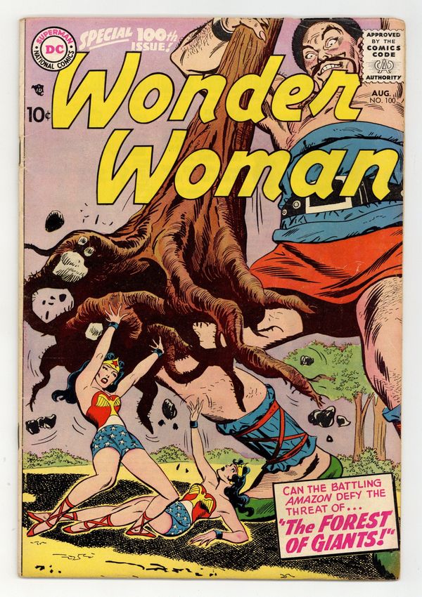 Cover pencils by Ross Andru, inks by Mike Esposito. "The Forest of Giants: Ch. 1: The Challenge of Dimension X," script by Robert Kanigher, pencils by Ross Andru, inks by Mike Esposito; Wonder Woman is challenged by her exact double from another dimension. "The Forest of Giants: Ch. 2" starring Wonder Woman, Wonder Woman of Dimension X, Hippolyta, and Alpha, script by Robert Kanigher, pencils by Ross Andru, inks by Mike Esposito. Marriage a la Mode article by Julius Schwartz. "Wonder Woman's 100th Anniversary," script by Robert Kanigher, pencils by Ross Andru, inks by Mike Esposito; The Amazonians try to record Wonder Woman's 100th adventure for their time capsule. 36 pages, Full Color. Cover price $0.10. Grade: VG- 3.5 explanation of grade Condition: Used (collectible)