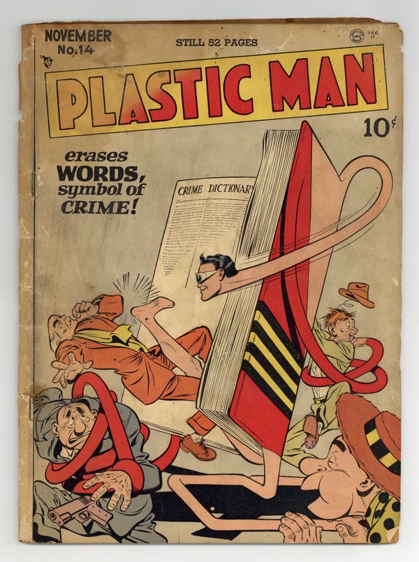 Untitled Plastic Man story starring Words, script by Bill Woolfolk. A Hard Guy Called Concrete starring Plastic Man, script by Joe Millard. Woozy story, script by Bill Woolfolk. Restful Vacation text story starring Plastic Man. Untitled Plastic Man Bloodhound with Bud Bickram, script by Jack Cole. Jack Cole cover/interior art. 52 pgs. $0.10. Cover price $0.10. Grade: FR 1.0 explanation of grade Condition: Used (collectible)