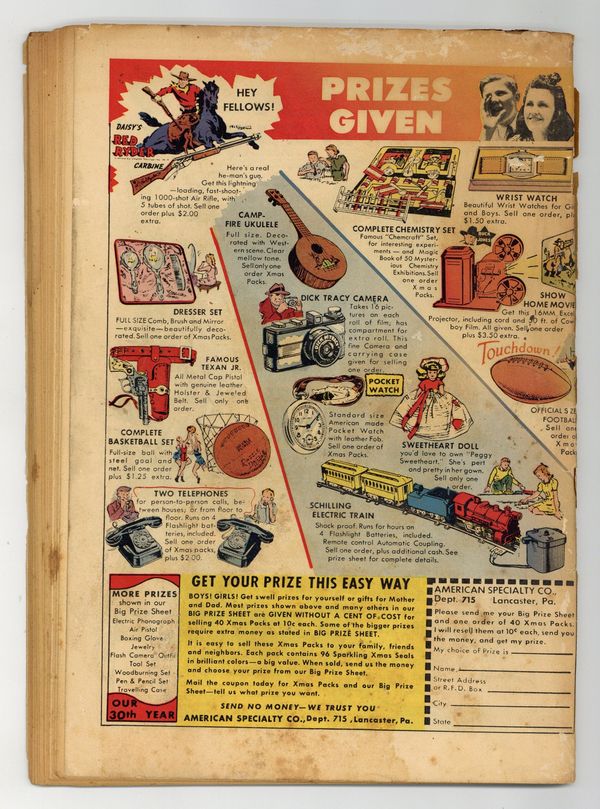 - 7.25" Spine split from top. Centerfold detached at one staple.