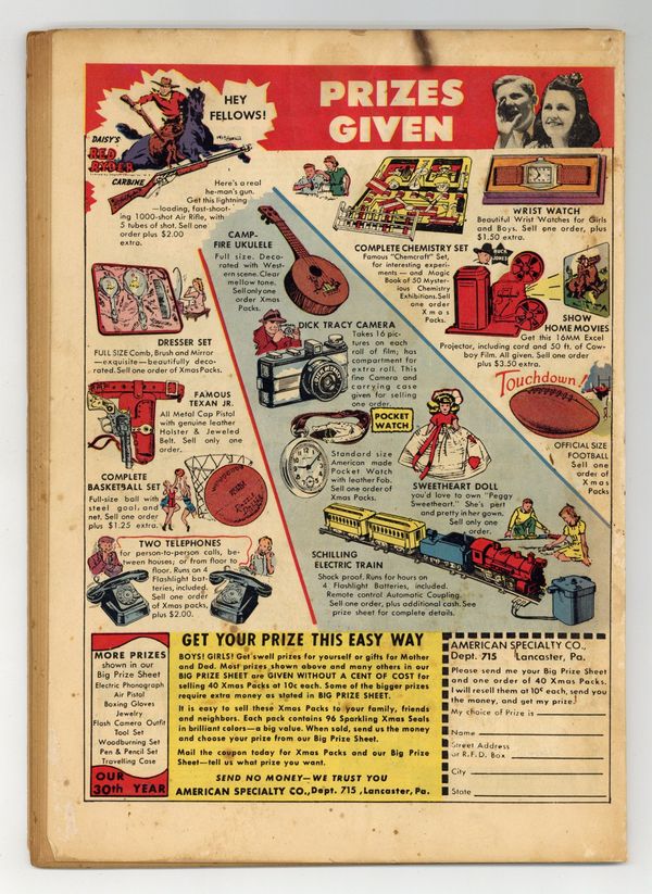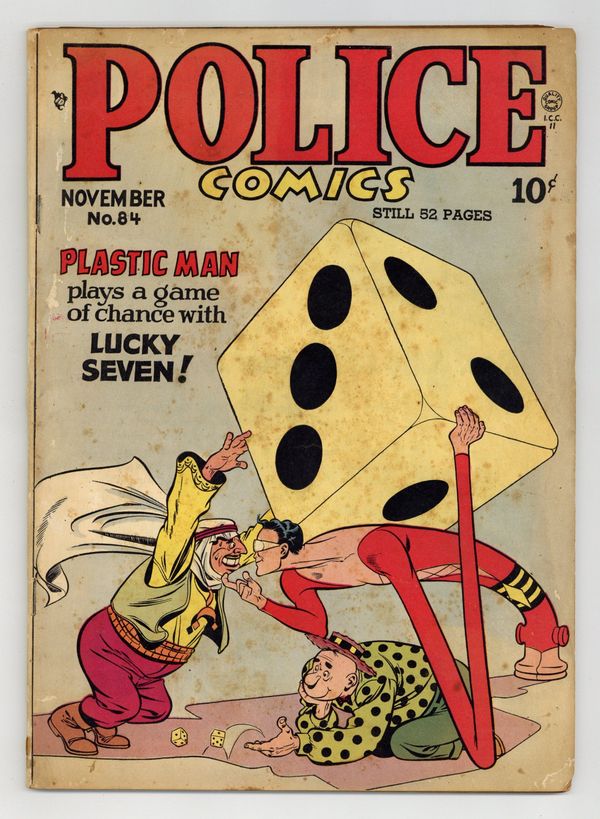 Cover art by Jack Cole. Lucky Seven starring Plastic Man, art by Jack Cole. Dewey Drip story, script and art by Joe Devlin. Honeybun story, script and art by Paul Gustavson. Candy For President starring Candy. Spirit story, script by Bill Woolfolk, art by Lou Fine. Suspicious Character text story starring Plastic Man. Manhunter story, art by Al Bryant. 52 pgs. $0.10. Cover price $0.10. Grade: GD+ 2.5 explanation of grade Condition: Used (collectible)