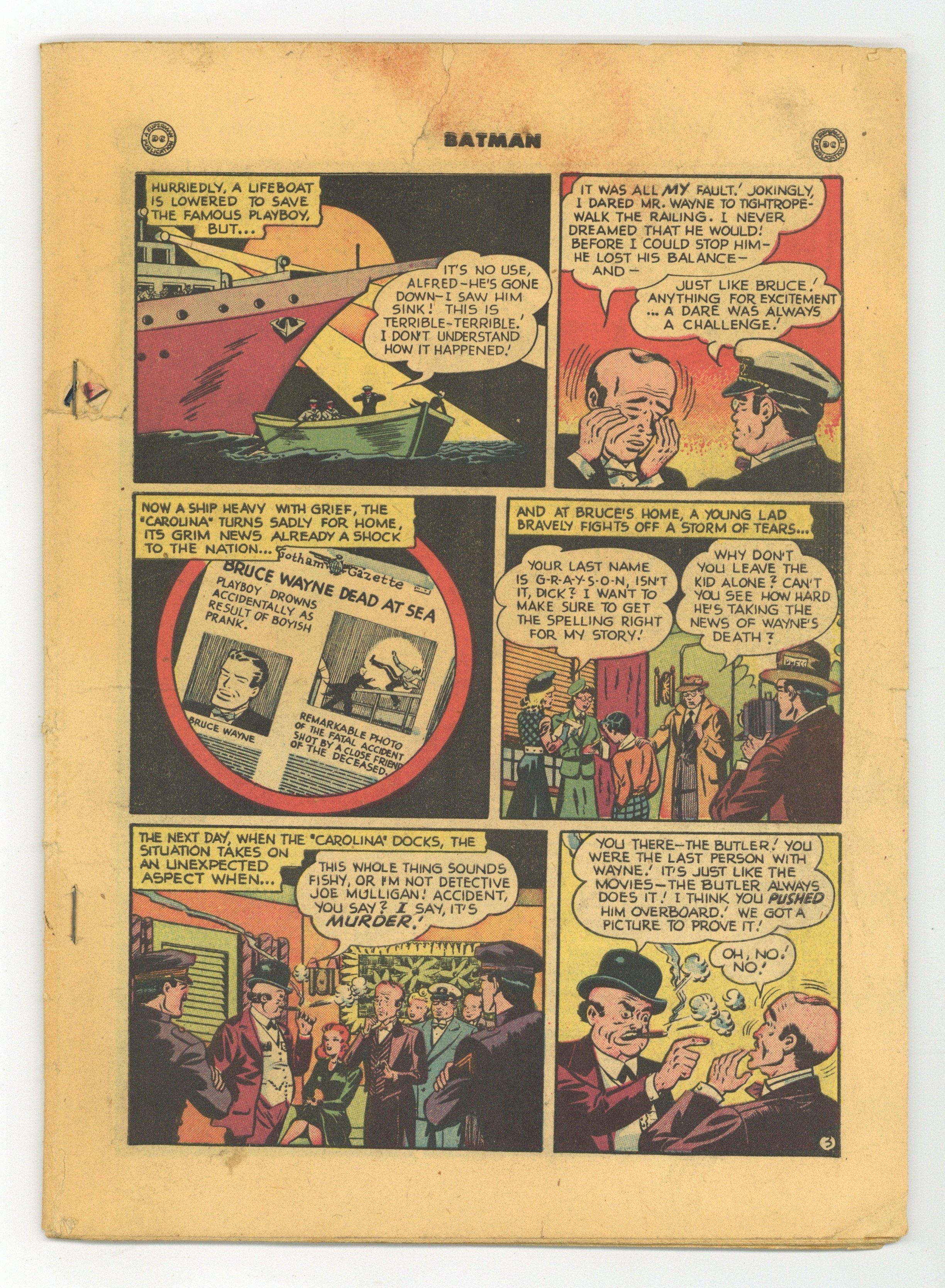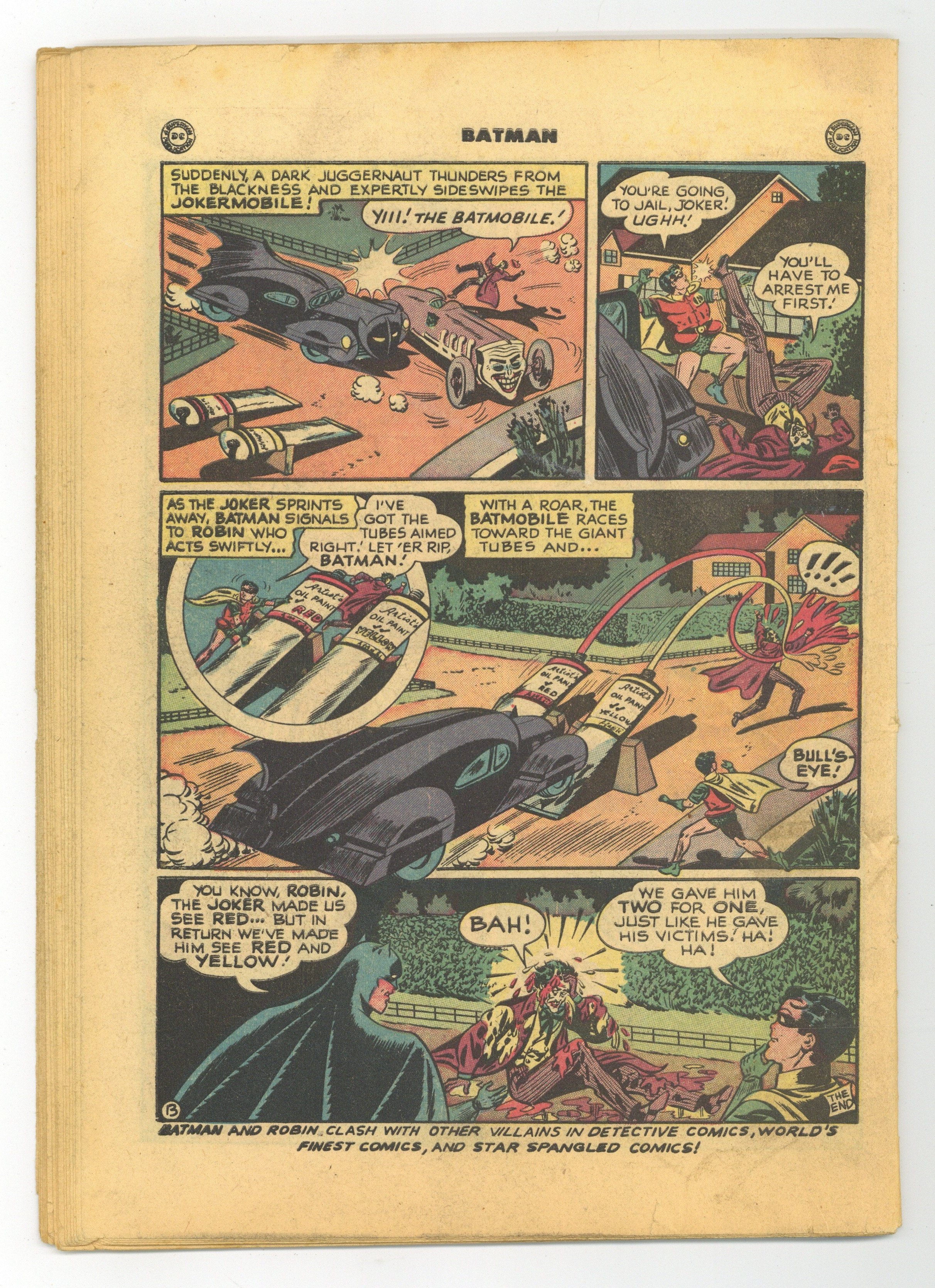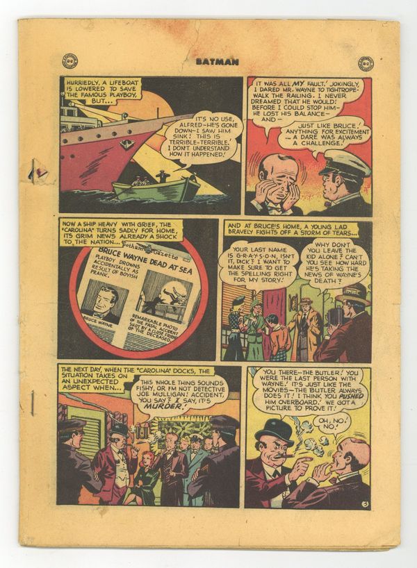 Cover by Win Mortimer. The Man With the Automatic Brain!:, script by Bill Finger, pencils by Bob Kane (Batman and Robin figures only) and Lew Sayre Schwartz, inks by Charles Paris; The Thinker, using a machine he created, pretends to discover Batmans secret identity; To prevent The Thinker from achieving his goal, Bruce stages his death with Alfred's help; Vicki Vale takes a picture of Alfred tossing a dummy of Bruce into the ocean; Alfred is taken to prison for the murder of Wayne. Batman and the Vikings!, pencils by Bob Kane, inks by Charles Paris; When Bruce and Dick visit the Gotham City museum, they note an image of a Viking that looks like Bruce Wayne.....and who is labeled a coward, so they visit Carter Nichols to go back in time to discover the truth. Untitled two-page Peg story by Henry Boltinoff. Fearless Wise Man text story, art by Raymond Perry. Cartoon Flips Starring Batman activity page by Martin Naydel. The Happy Victims!, script by Bill Finger, pencils by Bob Kane (Batman and Robin figures only) and Lew Sayre Schwartz, inks by Charles Paris; The Joker blackmails people into setting up fake robberies; The robberies stop when he tries to blackmail Bruce Wayne. 52 Pages, Full Color. Cover price $0.10. Grade: Coverless explanation of grade Condition: Used (collectible)