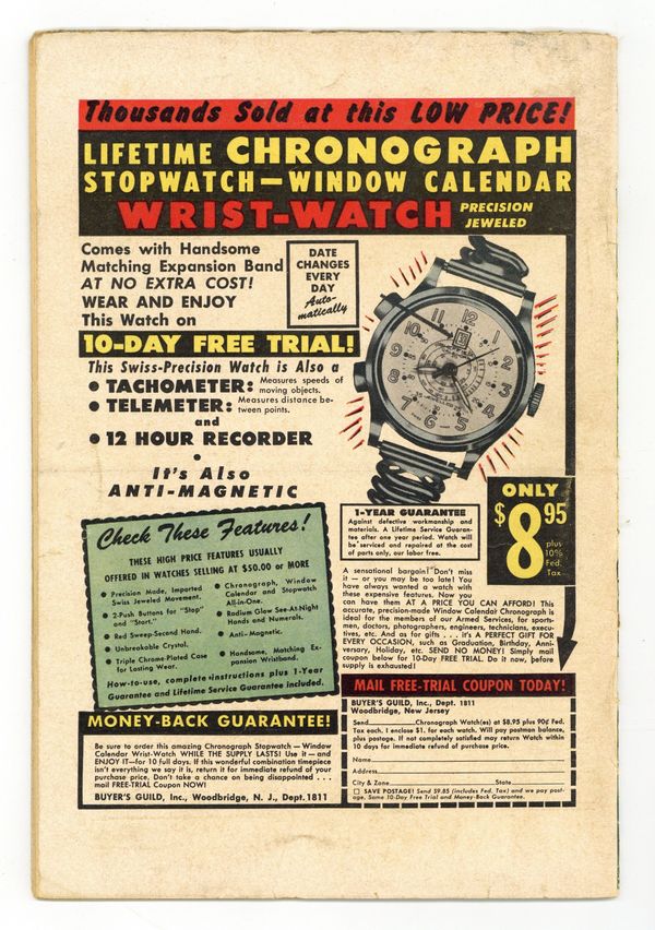 Cover by Maurice Whitman. Edited by J. F. Byrne. Stories and art by Bill Benulis, A. Albert, and John Belcastro. Cerebrex, the most powerful supercomputer on Earth, goes killbot-crazy after a mad scientist gives it Hitler's brain; Lance and his space station are captured by a beautiful alien queen and her troops; Martians cause droughts by siphoning off the Earth's water in the far-future year of 1985. Cerebrex; The Wonder-Warp; The Martian Plague; Strangers on Satellite C; Among the Missing. Final issue of the series. 36 pages, Full Color. Cover price $0.10. Grade: GD- 1.8 explanation of grade Condition: Used (collectible)