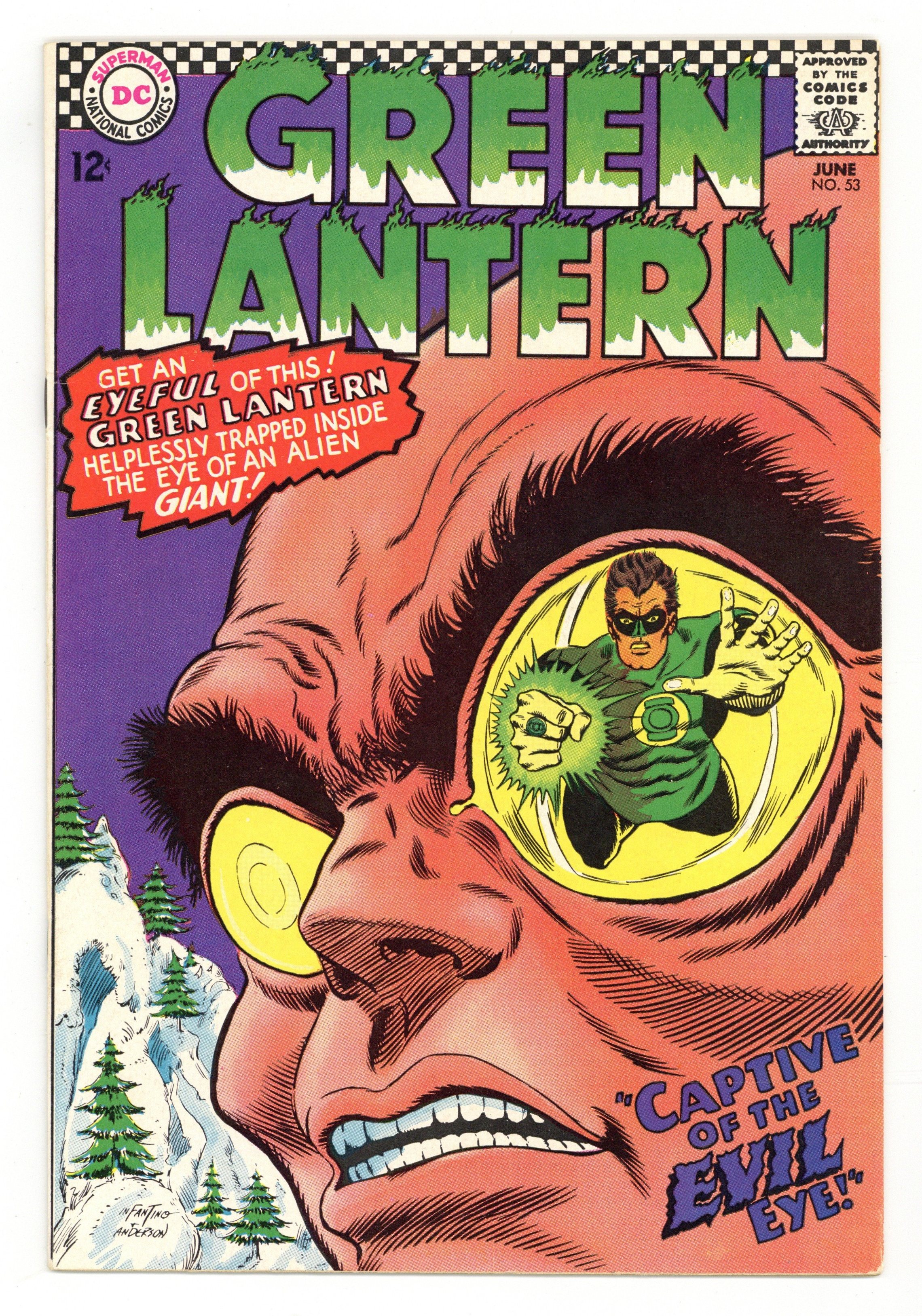 Cover pencils by Carmine Infantino, inks by Murphy Anderson. Captive of the Evil Eye!, script by John Broome, art by Gil Kane; Green Lantern fights a giant alien who is trying to steal the oxygen in the earth's atmosphere. Superman ad. The Flash/ The Spectre ad. Two Green Lanterns in the Family!,script by John Broome, pencils by Carmine Infantino, inks by Sid Greene; Hal's sister-in-law believes that her husband Jim is Green Lantern. Letter to the editor from comic writer Mark Evanier. 36 pgs., full color. $0.12. Cover price $0.12. Grade: FN+ 6.5 explanation of grade Condition: Used (collectible)