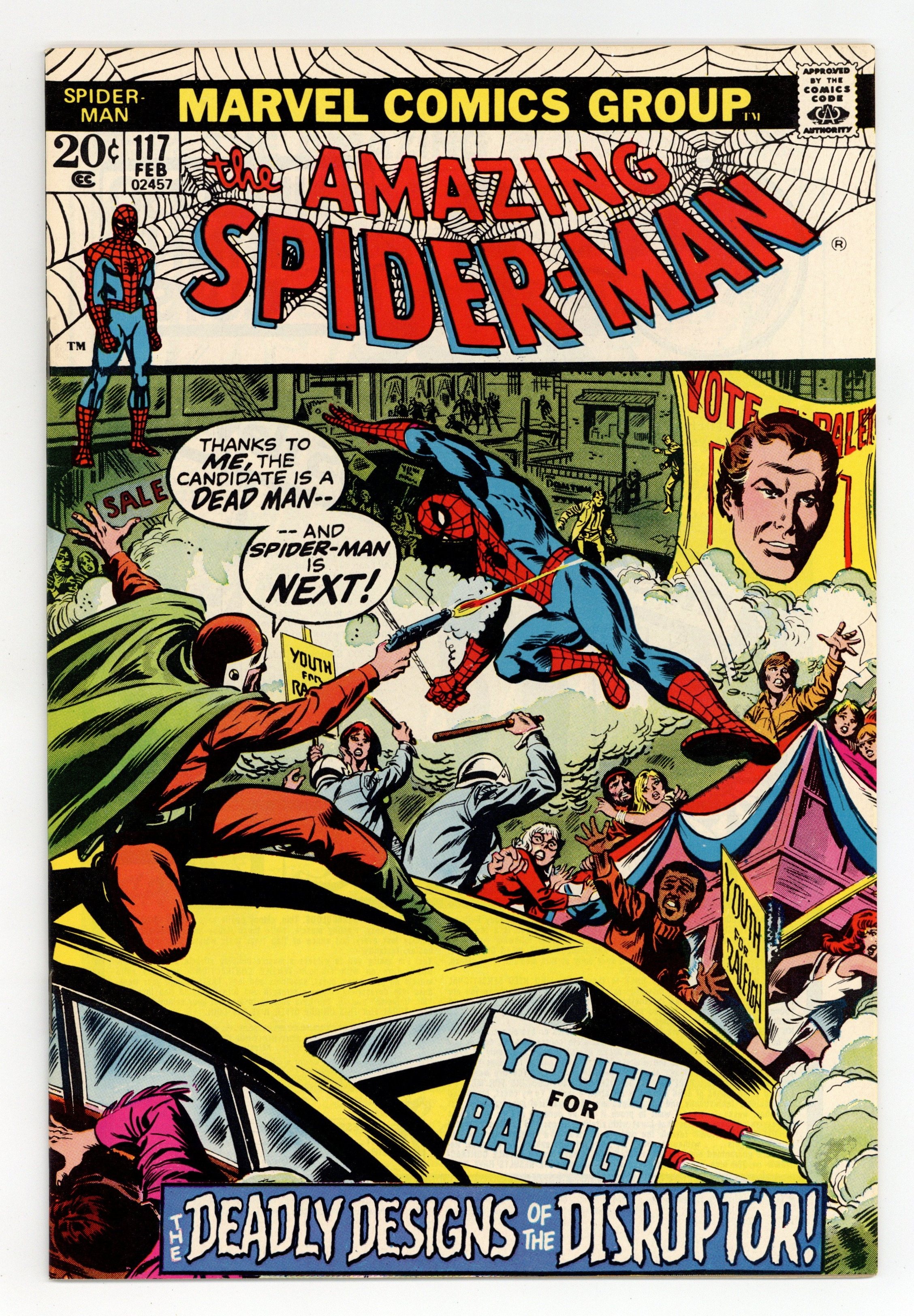 Starts Jan 26 "The Deadly Designs of the Disruptor!" Part 2 of 3. Script by Stan Lee (original) and Gerry Conway (updates). Pencils by John Romita. Inks by Jim Mooney, Mike Esposito, and Tony Mortellaro (backgrounds). Cover by John Romita and Jim Mooney. Thanks to the speed and skill of the wall-crawler, everyone survived the ceiling collapse at Richard Raleigh's election rally! And now the hunt is on for the culprit! Meanwhile, Raleigh holds another rally. And this one is sabotaged by the Disruptor! Who is he? No one knows, but the Disruptor is bound and determined to shut down Raleigh's bid for mayor! And it falls to Spider-Man to save the vote! Cameo appearances by J. Jonah Jameson, Joe Robertson, Norman Osborn, Gwen Stacy, Mary Jane Watson, Harry Osborn, Aunt May, and the Smasher. (Notes: ASM issues 116-118 are a revised, re-edited, and colorized version of Spectacular Spider-Man Magazine #1. This issue includes numerous new panels and pages to align with Spider-Man's current continuity. ASM 117 was reprinted in Marvel Tales #96.) 32 pages. Cover price $0.20. Grade: VF 8.0 explanation of grade Condition: Used (collectible)