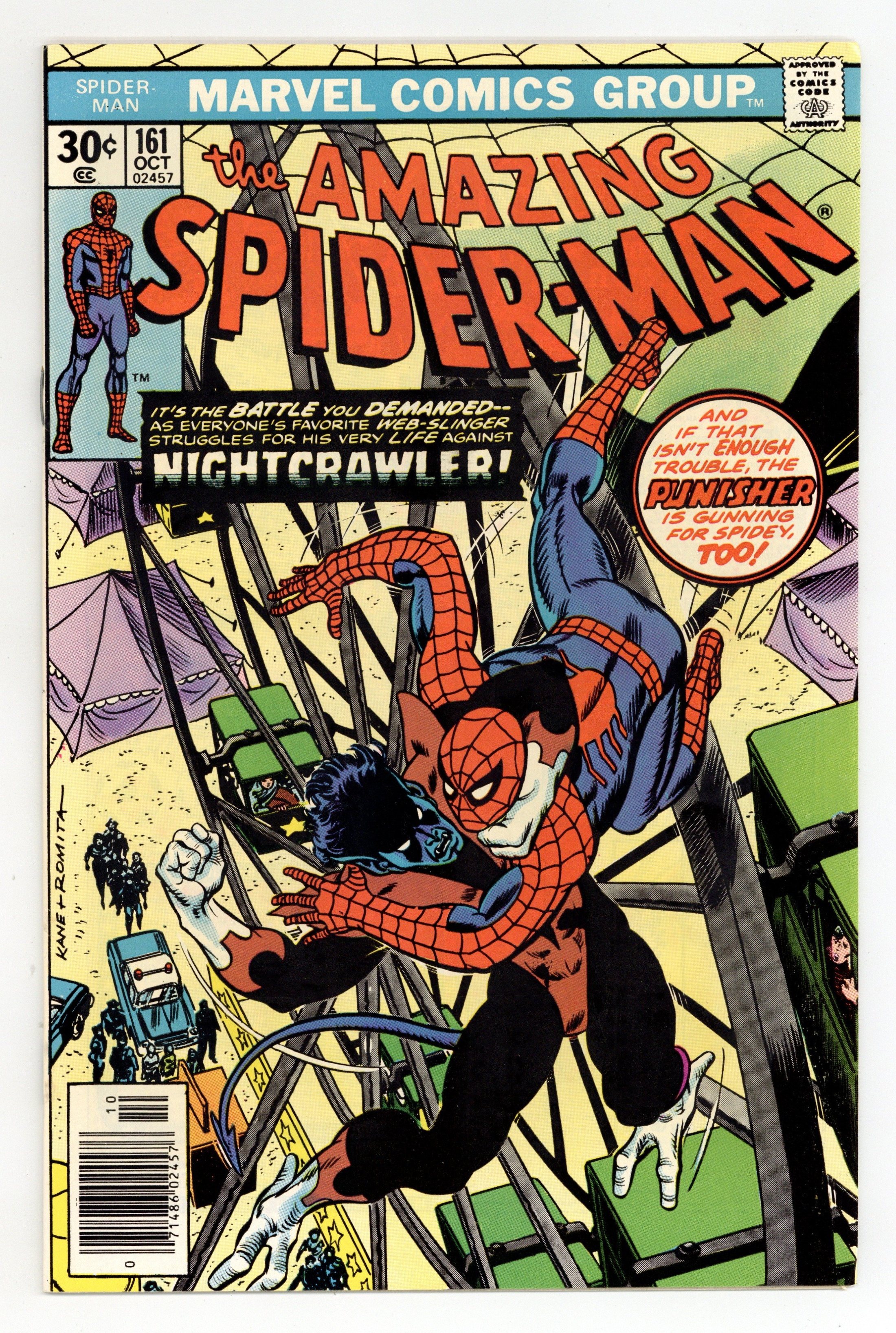 Starts Jan 26 "And the Nightcrawler Came Prowling, Prowling" Part 1 of 2. Guest-starring Nightcrawler. Script by Len Wein. Art by Ross Andru (breakdowns), Mike Esposito (finishes), and Dave Hunt (backgrounds). Cover by Gil Kane and John Romita. Someone is going around New York City impersonating the Punisher! The Amazing Spider-Man thinks the sniper might be Nightcrawler! While the new X-Man believes the shooter could be the web-slinger! First at Coney Island and later at the Roosevelt Island Tramway, Nightcrawler and the wall-crawler clash amid their mutual confusion! But the situation becomes crystal clear once the heroes find themselves in the crosshairs...of the real Punisher! The bullets fly next issue! Cameo appearances by the Punisher, Wolverine, Colossus, Mary Jane Watson, Harry Osborn, Liz Allan, Joe Robertson, and J. Jonah Jameson. (Notes: This issue features the first meeting between Spider-Man and Nightcrawler. The web-slinger meets all of the new X-Men for the first time in Marvel Team-Up Annual 1. This story was reprinted in Marvel Tales 214.) 36 pages. Cover price $0.30. Grade: VF- 7.5 explanation of grade Condition: Used (collectible)