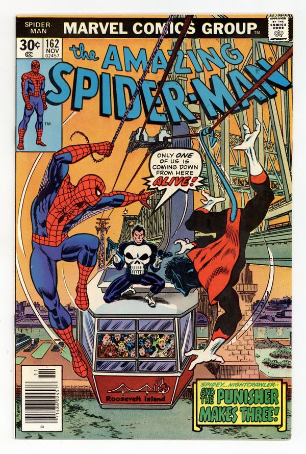 Starts Jan 26 "Let the Punisher Fit the Crime!" Part 2 of 2. Guest-starring Nightcrawler and the Punisher. Script by Len Wein. Art by Ross Andru (breakdowns), Mike Esposito (finishes), and Dave Hunt (backgrounds). Cover by Ross Andru and John Romita. After a scuffle atop the Roosevelt Tramway; the Punisher, Nightcrawler, and Spider-Man come to a meeting of the minds! The trio realizes that none of them are the lethal sniper terrorizing the city! And they vow to catch the mysterious gunman before his next kill! Acting on a tip; the web-slinger, Punisher, and Nightcrawler converge on a street festival to smoke out the shooter! Can the heroes solve the killer's deadly puzzle? Or perhaps better stated...his Jigsaw puzzle? First appearances of Dr. Marla Madison and Jigsaw. Cameo appearances by Harry Osborn, Flash Thompson, Mary Jane Watson, and J. Jonah Jameson. (Notes: The Punisher appears next in Amazing Spider-Man 174. Jigsaw returns in Amazing Spider-Man 188. This story was reprinted in Marvel Tales 215.) 36 pages. Cover price $0.30. Grade: VF 8.0 explanation of grade Condition: Used (collectible)