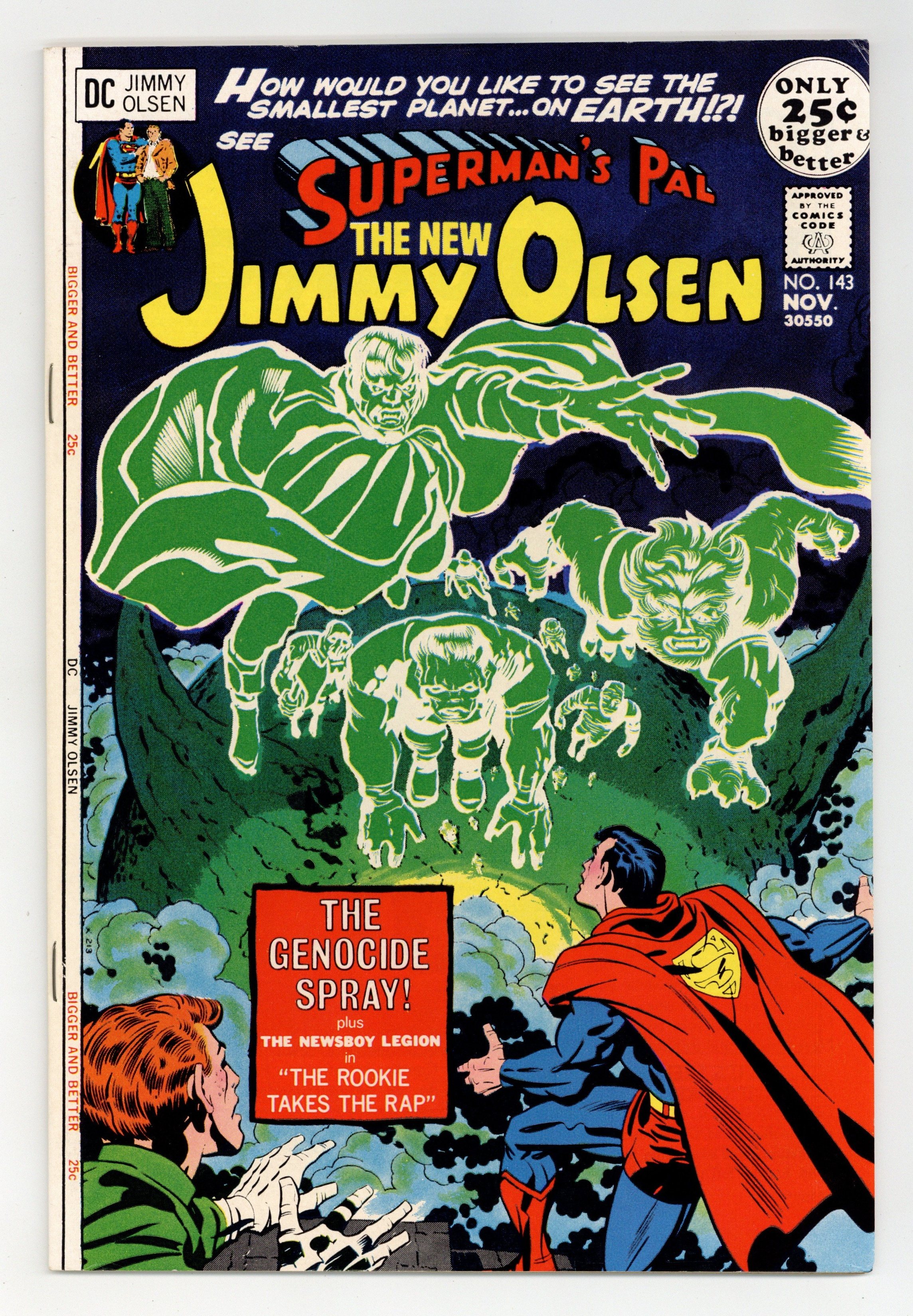 Starts Jan 26 Cover pencils by Jack Kirby pencils, inks by Mike Royer. Genocide Spray!, script by Jack Kirby, pencils by Jack Kirby and Murphy Anderson (some Superman and Jimmy Olsen heads), inks Vince Collettal; Superman and Jimmy uncover the secrets of Transilvane, while the Newsboy Legion witness the final fate of the killer of the original Jim Harper. The Alien Thing!!!--Strange Stories of the D.N.A. Project, script and pencils by Jack Kirby, inks by Vince Colletta. The Rookie Takes the Rap starring the Newsboy Legion, script by Jack Kirby and Joe Simon, pencils by Jack Kirby, inks by Joe Simon. Letter from comics writer Mark Gruenwald. 52 Pages, Full Color. Cover price $0.25. Grade: VF+ 8.5 explanation of grade Condition: Used (collectible)