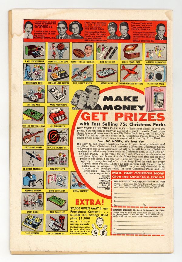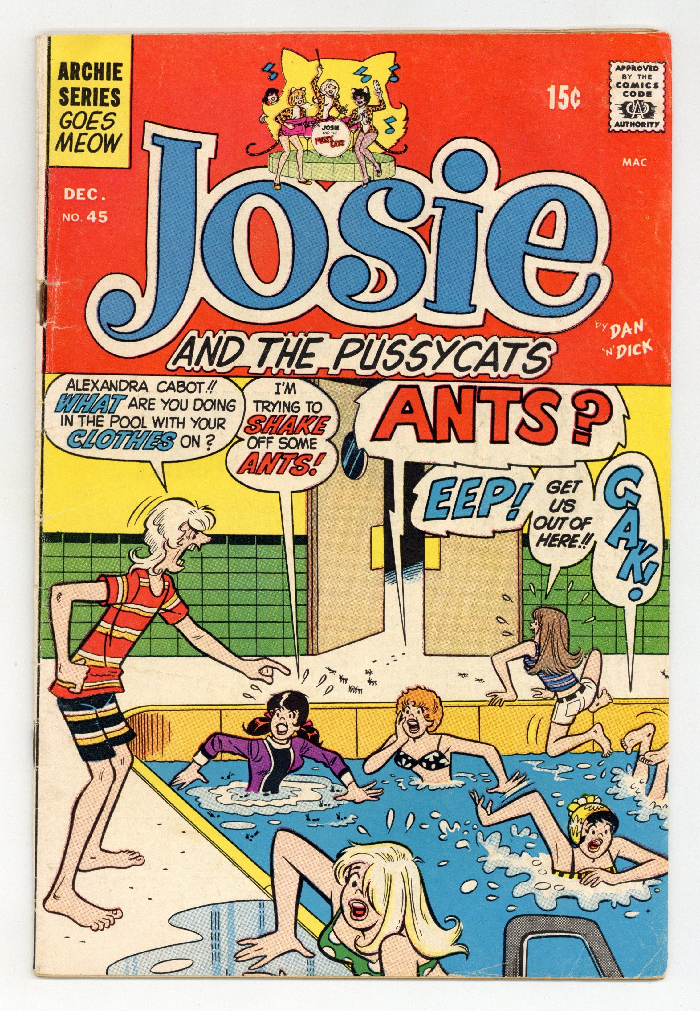 Starts Feb 2 Cover pencils by Dan DeCarlo. Decisions Decisions, script by Dick Malmgren; Alexandra refuses to join Josie and Melody's new band, the Pussycats, unless they change the name to "Alexandra's Cool Time Cats"; First appearance of Valerie; First appearance of the Pussycats musical group. Pussy Footing, script by Dick Malmgren; Josie, Melody and Valerie play their first concert in their new Pussycats costumes. Off To a Good Start, script by Frank Doyle; Alexandra tries to use her powers of mind control to get Alan M. away from Josie. Pencils by Dan DeCarlo, inks by Rudy Lapick. House ad for the new title "Everything's Archie." 36 pgs. $0.15. Cover price $0.15. Grade: GD+ 2.5 explanation of grade Condition: Used (collectible)