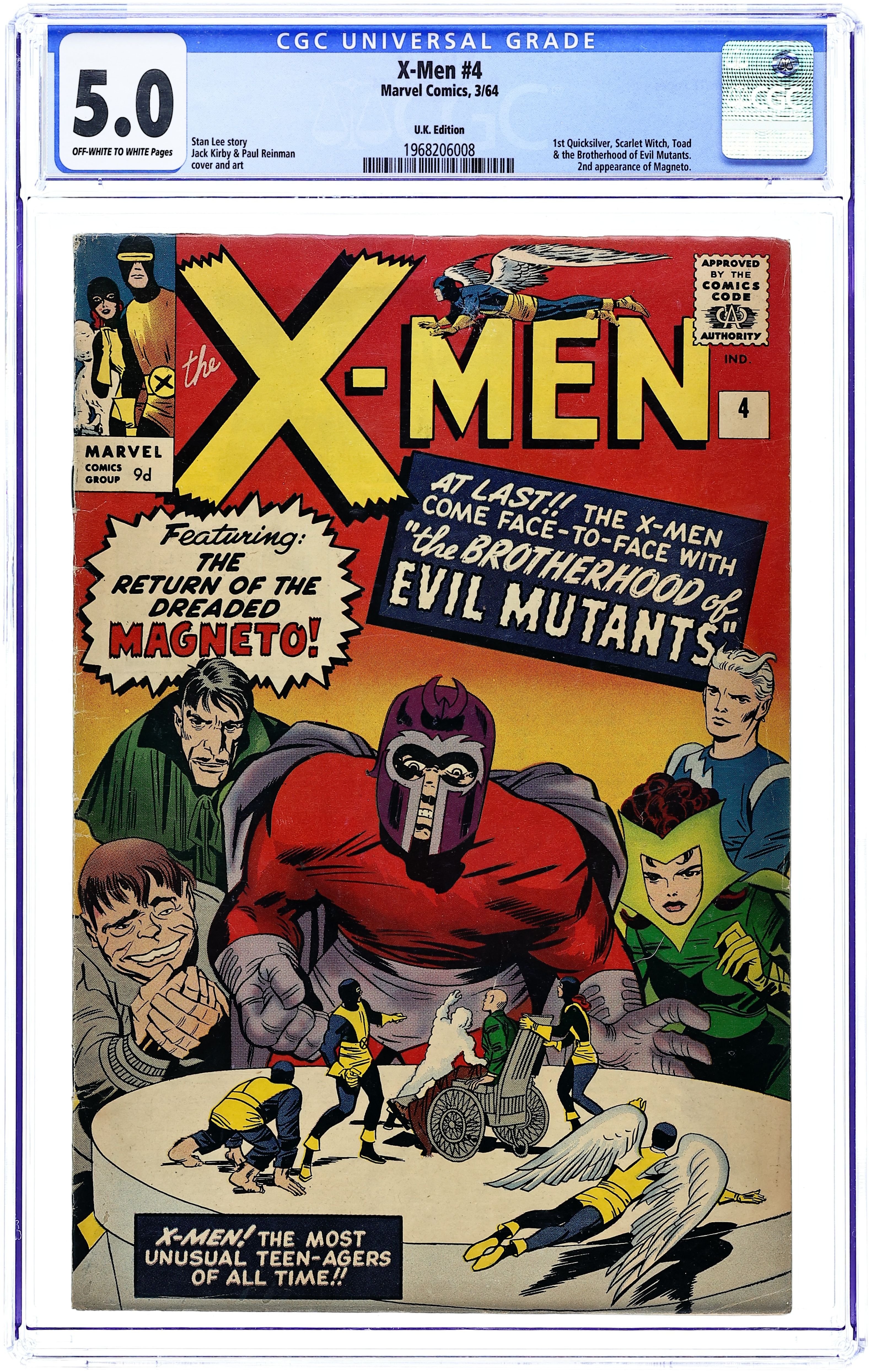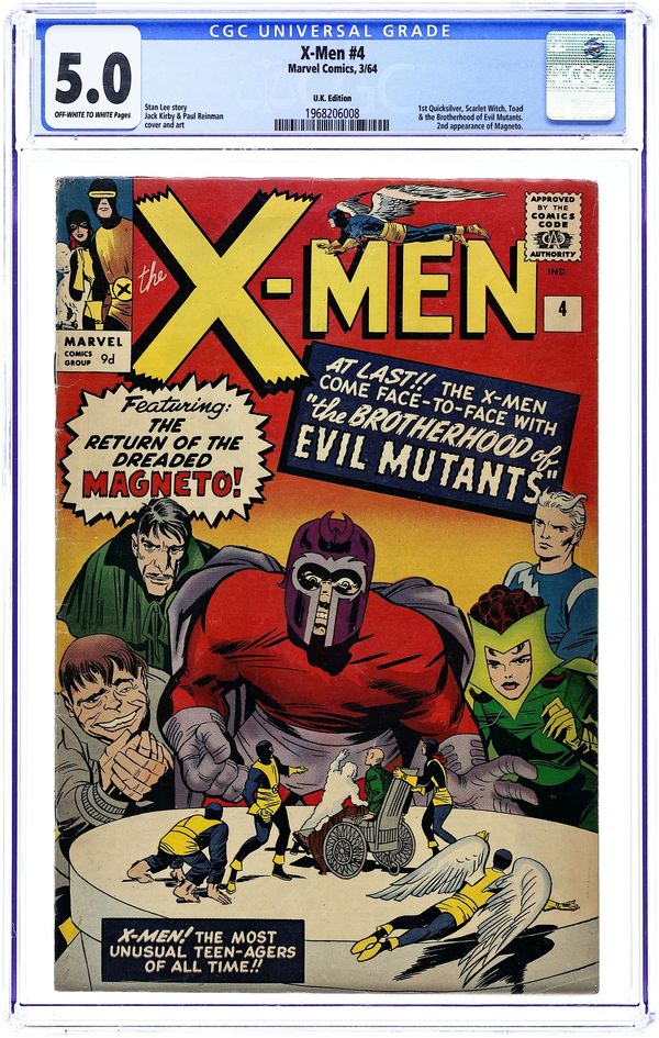 UK edition. Identical to US edition, but has 9d cover price. Quicksilver, Scarlet Witch, Mastermind, and Toad appear for the 1st time, and Magneto makes his 2nd appearance. Cover pencils by Jack Kirby. The Brotherhood of Evil Mutants!, script by Stan Lee, pencils by Jack Kirby, inks by Paul Reinman; Magneto and his new Brotherhood of Evil Mutants steals a freighter and uses it to take over the South American nation of Santo Marco; The X-Men invade and take the country back; Xavier is caught in an explosion and loses his mental powers. Grade: CGC 5.0 explanation of grade Condition: Used (collectible)