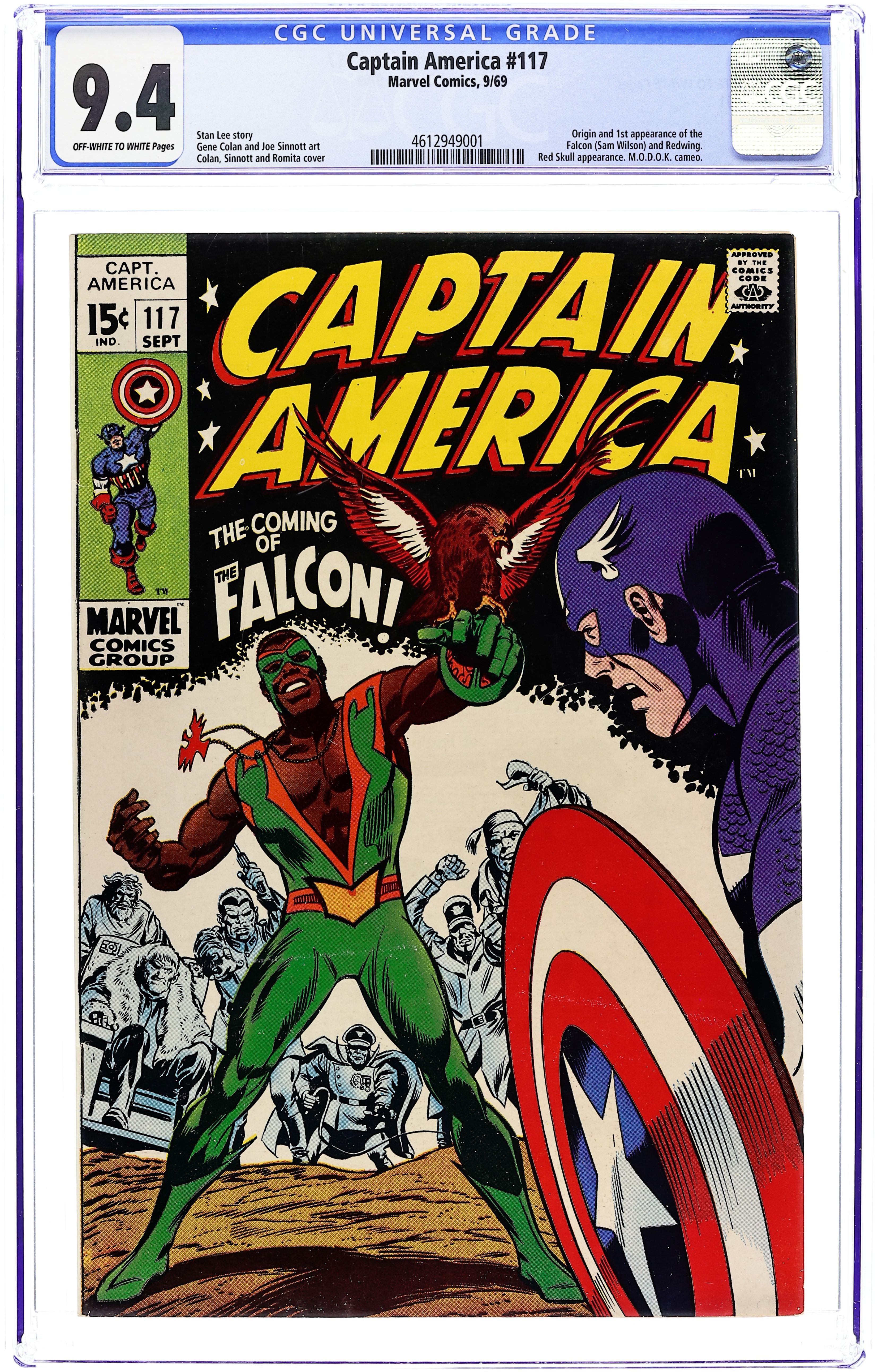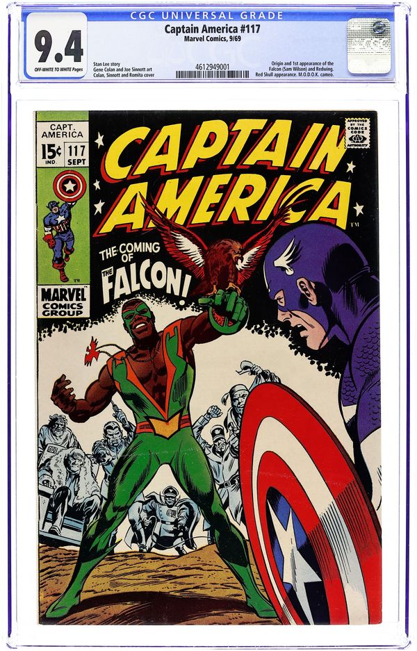 Starts Jan 3 Cover pencils by Gene Colan and John Romita (alterations), inks by Joe Sinnott and John Romita (alterations). First appearance and origin of the Falcon in "The Coming of... the Falcon!", script by Stan Lee, pencils by Gene Colan, inks by Joe Sinnott; With the Red Skull previously having switched bodies with Captain America, the Skull uses the Cosmic Cube to send Cap to the tropical island home of the Exiles; There Cap encounters a falconer from Harlem who had been hired by the Exiles but who is now attempting to help the island natives kick the Exiles from their home; Cap joins forces with the falconer who, with Cap's urging, dons a costume and takes the name the Falcon. Letter to the editor from writer James Van Hise. 36 pgs., full color. $0.15. Cover price $0.15. Grade: CGC 9.4 explanation of grade Condition: Used (collectible)