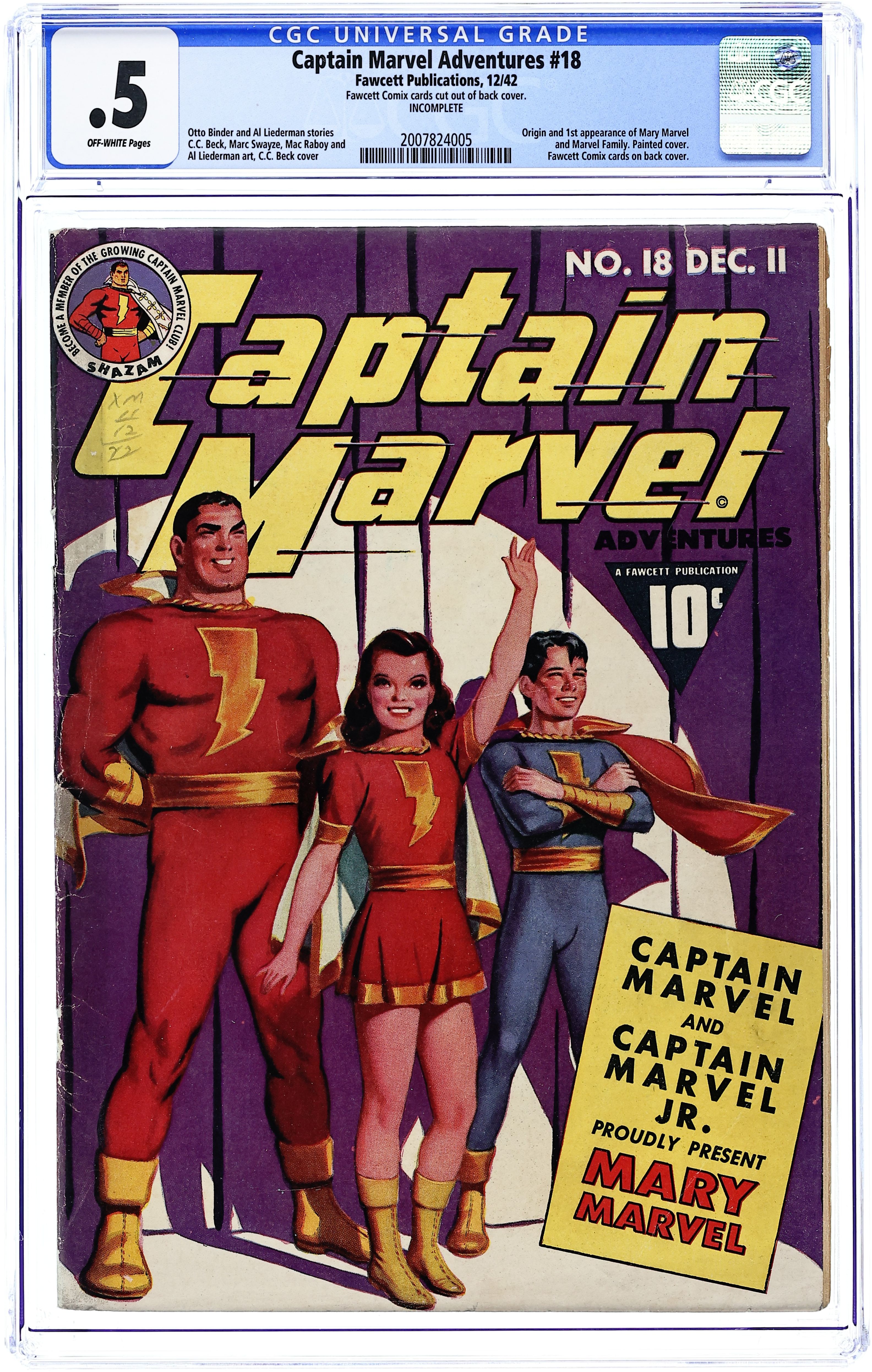 1st appearance and origin of Mary Marvel and the Marvel Family. Cover by C.C. Beck. Stories by Otto Binder, Al Liederman and unknown. Art by Marc Swayze, Al Liederman and unknown. In "Captain Marvel Introduces Mary Marvel" by Otto Binder and Marc Swayze, Billy Batson accidentally discovers that a young girl, appearing on the Station W.H.I.Z. radio show 'The Mental Marvel Quiz,' possesses half of a strange locket that he has the other half to, and that her former nurse confirms the fact that Billy and Mary are actually twins! Appearances by Captain Marvel, Jr. and Shazam. Captain Marvel also stars in: "Captain Marvel Fights a Nightmare"; "The What-Not Adventure"; and "The Three Wishes of Tim Tucker" with story by Otto Binder. Plus: Captain Kidd in an untitled tale by Al Liederman. And: 2-page text story "Killer in the North" by Carl Formes. 68 Pages, Full Color. Cover price $0.10. Grade: CGC 0.5 explanation of grade Condition: Used (collectible)