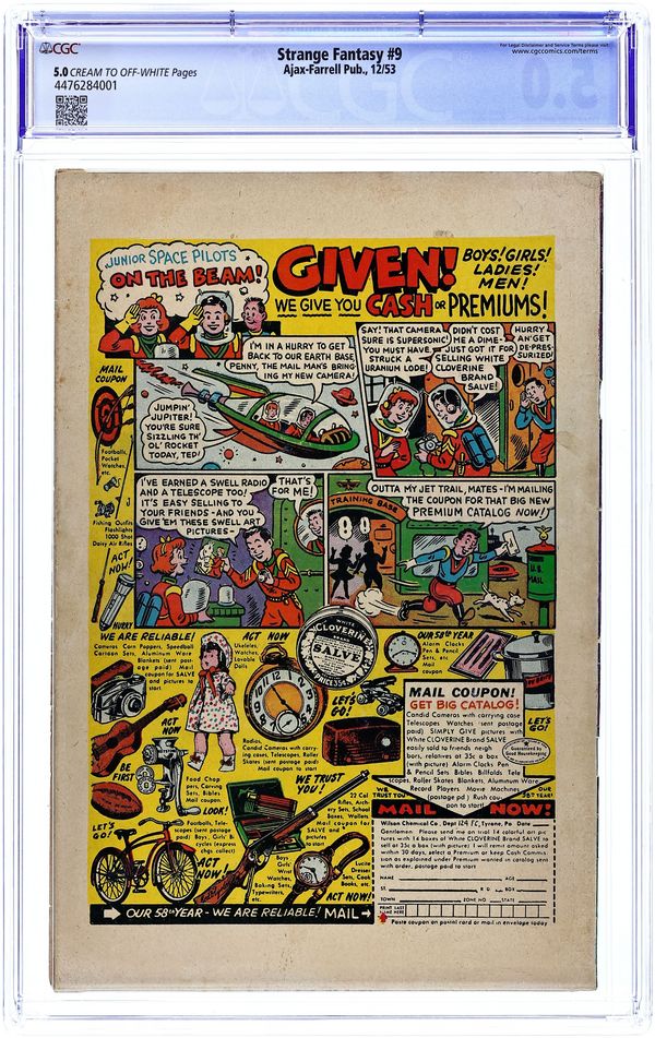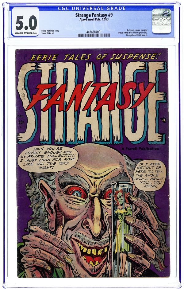 Stories and art by Bruce Hamilton and Steve Ditko. Offbeat pre-Code horror stories from Ajax-Farrell, with art by the Iger Shop staff. A man's long hair comes to life, in a truly bizarre escalating series of events partially illustrated by future Marvel legend Steve Ditko. An artist tries and fails to maintain the balance between madness and genius. Luther is cursed with the ability to know who is going to die. Dream of Horror; Hair Yee-eeee; Magic Formula; Portrait of Doom; Mirror of Death. 32 pages, Full Color. Cover price $0.10. Grade: CGC 5.0 explanation of grade Condition: Used (collectible)