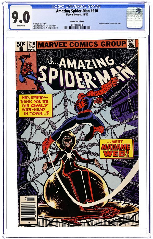 Newsstand Edition. "The Prophecy of Madame Web!" First appearance of Madame Web. Script by Denny O'Neil. Art by John Romita Jr. (breakdowns) and Joe Sinnott (finishes). Cover by John Romita Jr. and Al Milgrom. Masked gunmen barge into the board room of the Daily Globe and kidnap its publisher K.J. Clayton! Fortunately though, the web-slinger is nearby and gives chase! The wall-crawler doesn't catch the criminals, but he does catch a clue! A mysterious clairvoyant called Madame Web is somehow connected to the victim! After befriending the aging soothsayer and heeding her advice, Spider-Man rushes off to the rescue! Can the web-slinger find the missing publisher and get the Daily Globe back in circulation? Cameo appearance by J. Jonah Jameson. (Notes: Peter Parker ends his employment with the Daily Globe. Madame Web appears next in Amazing Spider-Man 216. John Romita Jr. begins his three-and-a-half year run as the penciler of the Amazing Spider-Man title.) 36 pages, full color. Cover price $0.50. Grade: CGC 9.0 explanation of grade Condition: Used (collectible)