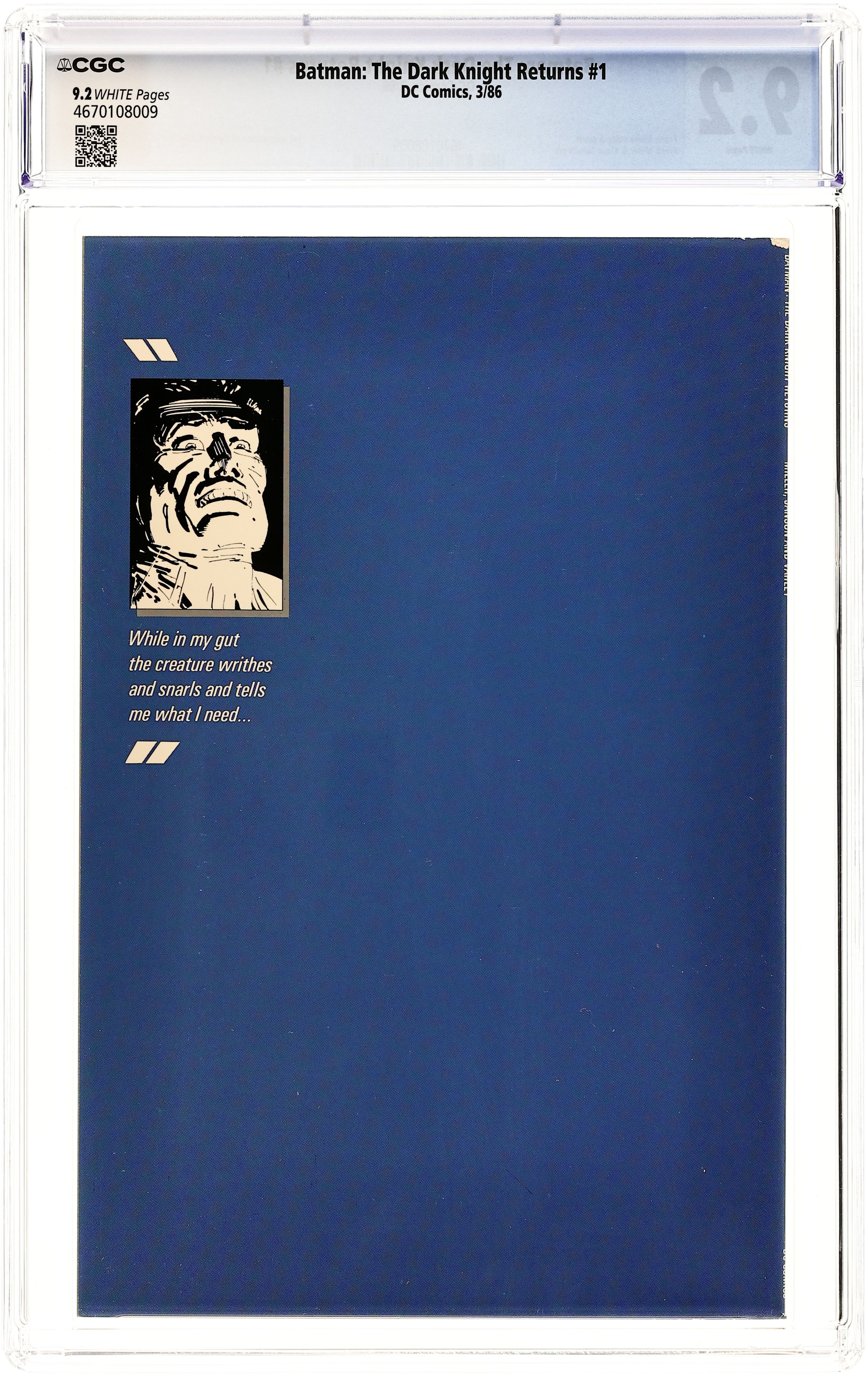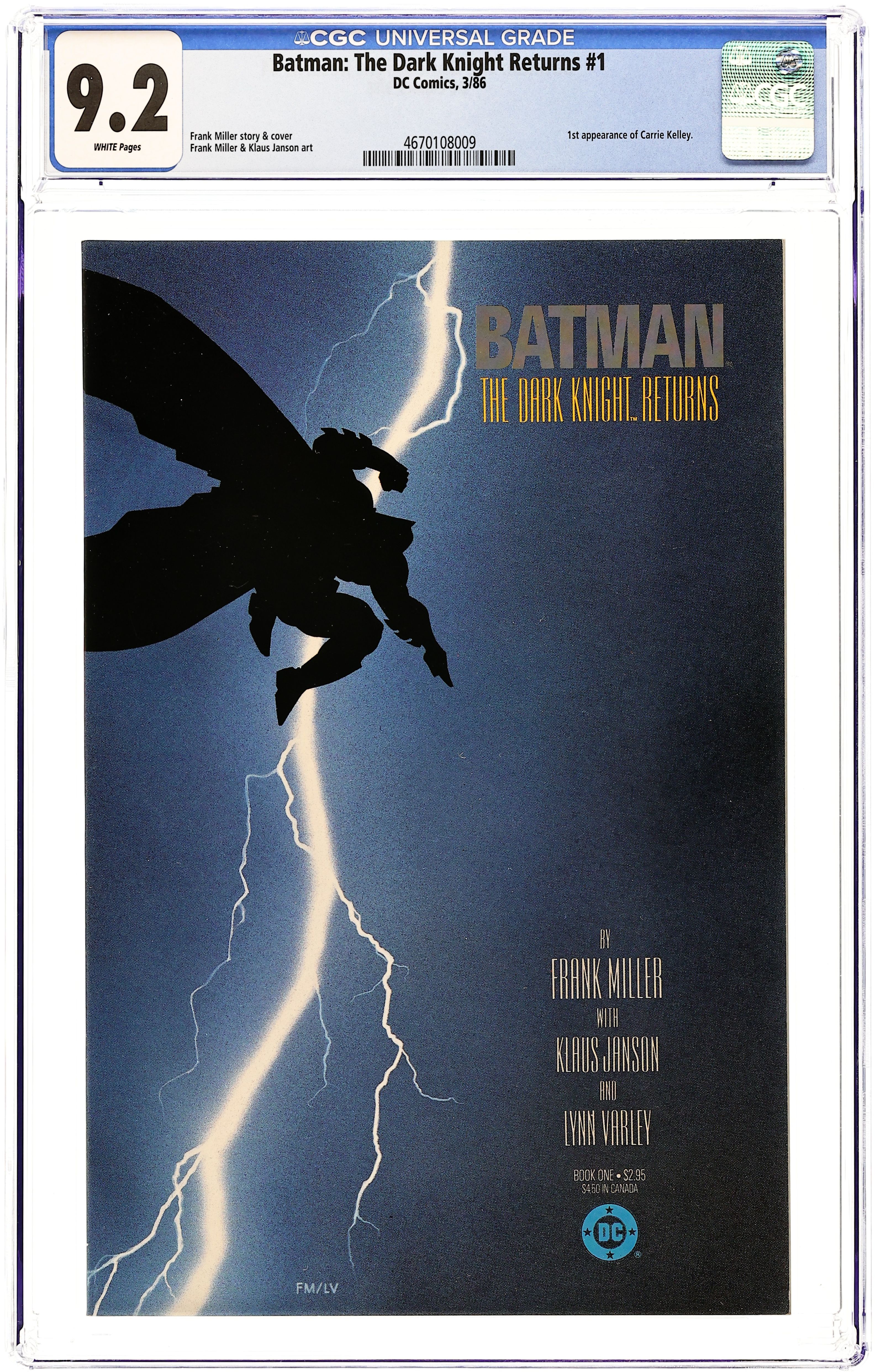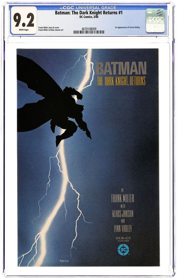 1st printing. NOTE: 2nd, 3rd, and 4th printings of #1 are labeled as such on the inside cover. Cover by Frank Miller. "The Dark Knight Returns," script and pencils by Frank Miller, inks by Klaus Janson; Set 20 years in the future, this story finds that in the absence of superheroes, criminals have run amok, and a gang called the Mutants are terrorizing Gotham City; Bruce Wayne has been retired from super-heroing for 10 years following the death of Jason Todd, the second Robin; Despite Wayne's funding of the rehabilitation of Harvey Dent (Two-Face), Dent returns to being a super-villain; Bruce, overcome with the grief over what Gotham has become, dons the Batman costume again and captures Dent. 52 pgs., full color. Cover price $2.95. Grade: CGC 9.2 explanation of grade Condition: Used (collectible)
