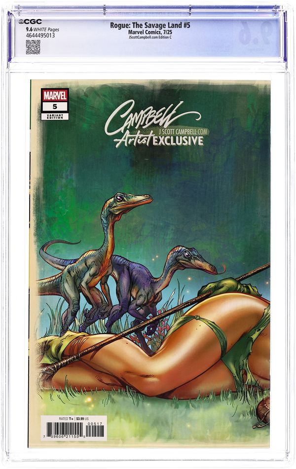Starts Jan 26 JScottCampbell.Com Exclusive Wraparound Cover by J. Scott Campbell. Written by Tim Seeley. Art by Zulema Scotto Lavina. A powerless Rogue and Magneto race to stop Zaladane's plot before it plunges the Savage Land into a second Ice Age! But what can a girl from Mississippi do against a god? And, even if she can stop the ascension, is Rogue saving the Savage Land just to hand it over to Zaladane?! 28 pages, full color. Rated T+ Cover price $3.99. Grade: CGC 9.6 explanation of grade Condition: Used (collectible) unless item is a new release