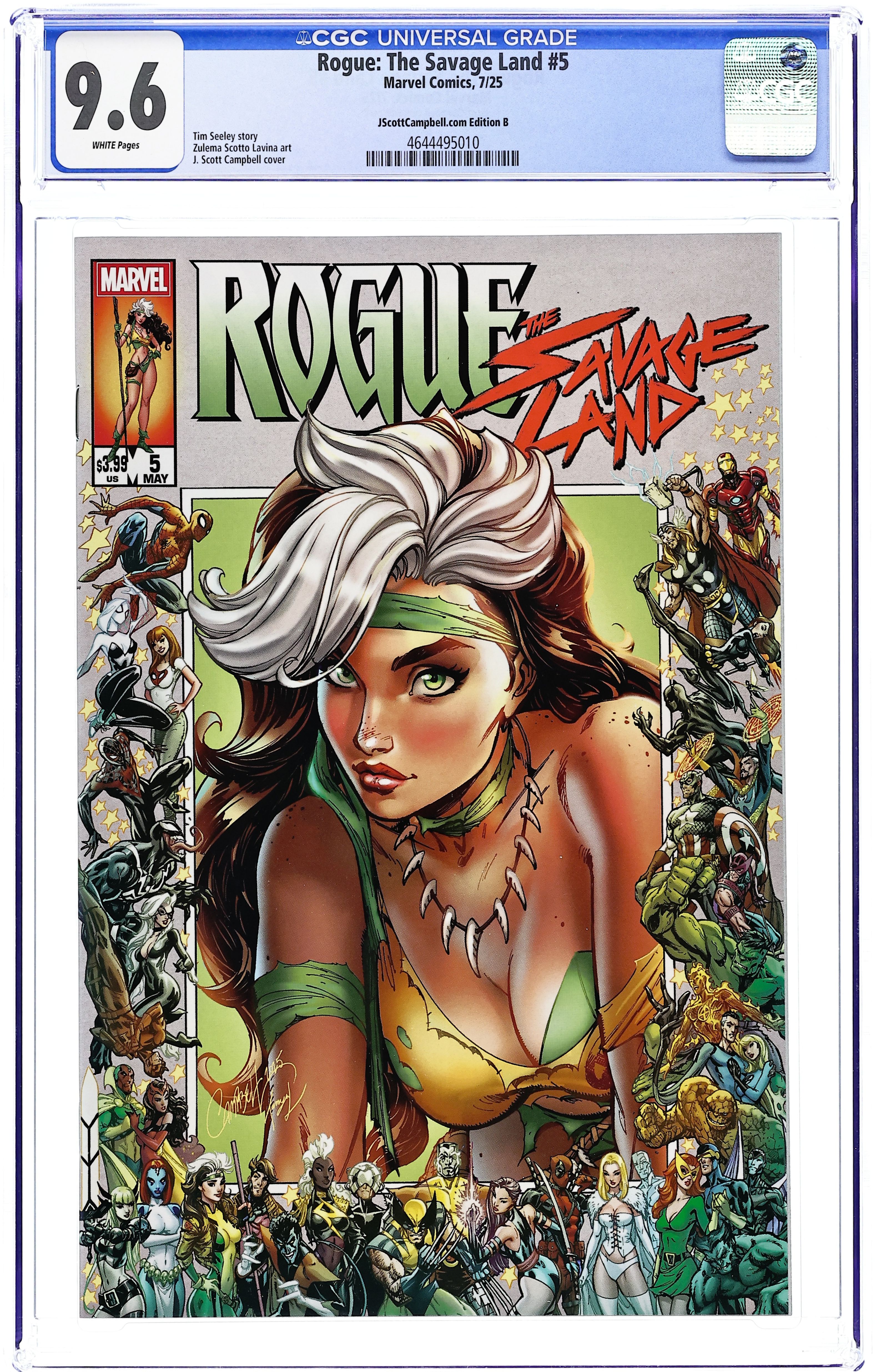 JScottCampbell.Com Exclusive "Border" Edition Variant Cover by J. Scott Campbell. Written by Tim Seeley. Art by Zulema Scotto Lavina. A powerless Rogue and Magneto race to stop Zaladane's plot before it plunges the Savage Land into a second Ice Age! But what can a girl from Mississippi do against a god? And, even if she can stop the ascension, is Rogue saving the Savage Land just to hand it over to Zaladane?! 28 pages, full color. Rated T+ Cover price $3.99. Grade: CGC 9.6 explanation of grade Condition: Used (collectible) unless item is a new release