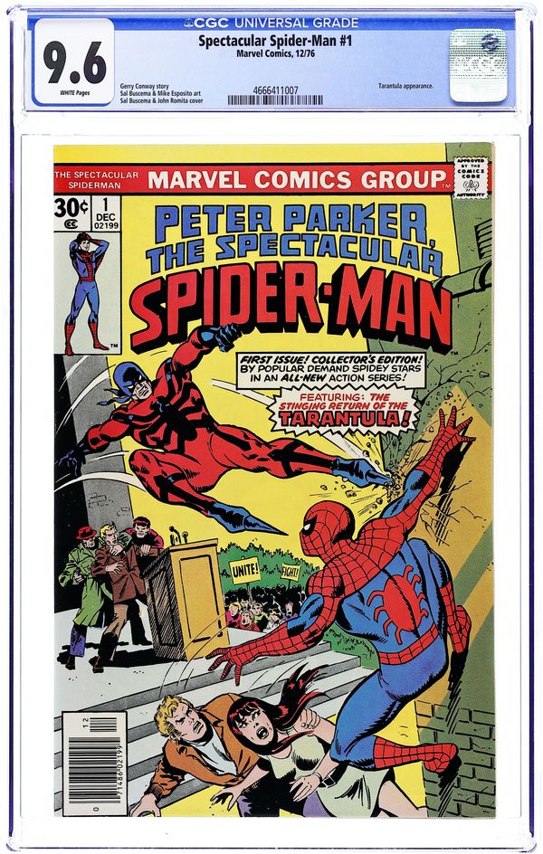 "Twice Stings The Tarantula!" Part 1 of 3. Script by Gerry Conway. Pencils by Sal Buscema. Inks by Mike Esposito. Cover by Sal Buscema and John Romita. The first issue of a brand new series for Spider-Man! The story opens with a bang as the Tarantula kidnaps the Empire State University vice-chancellor, despite the best efforts of the web-slinger, Flash Thompson, and Mary Jane Watson! Next, the Tarantula tries to kill the mayor, but this time the Spectacular Spider-Man is ready! Can the wall-crawler beat the Tarantula and save Mayor Abe Beame? First appearance of Edward Lansky (aka Lightmaster). (Notes: The Spectacular Spider-Man series became the third monthly title for Spider-Man. The first issue of the series debuted the same month as Amazing Spider-Man 163 and Marvel Team-Up 52. The letters page contains an essay from Gerry Conway describing the plans for the new Spider-Man title.) 32 pages Cover price $0.30. Grade: CGC 9.6 explanation of grade Condition: Used (collectible)