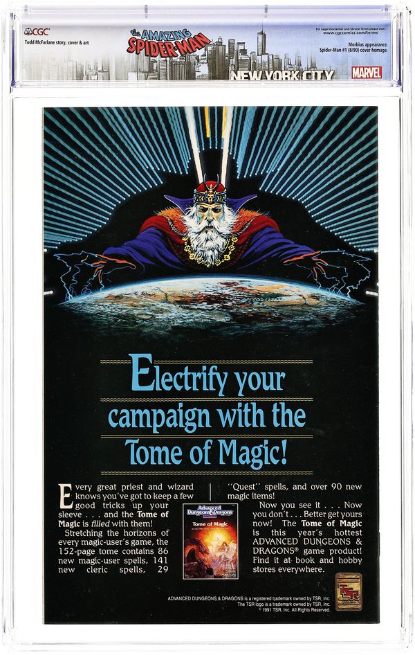 Direct Edition. Sub-City Part 1 of 2. Script and art by Todd McFarlane. Cover by Todd McFarlane. In Midtown Manhattan homeless people are disappearing off the streets. And a Daily Bugle reporter suspects foul play! The wall-crawler decides to stake out the area...and wait for something or someone suspicious to show up. And sure enough...a strange creature does -- right out of the sewer system! Spider-Man wants to follow into the sewers to investigate further, but he needs to wear his old black costume for camouflage. However that's a major nonstarter for Mary Jane...since she hates Spidey's black costume! What is a married web-slinger to do? Cameo appearances by J. Jonah Jameson and Morbius. (Note: The cover is an homage to Spider-Man (1990) issue #1.) 32 pages. Cover price $1.75. Grade: CGC 9.6 explanation of grade Condition: Used (collectible)