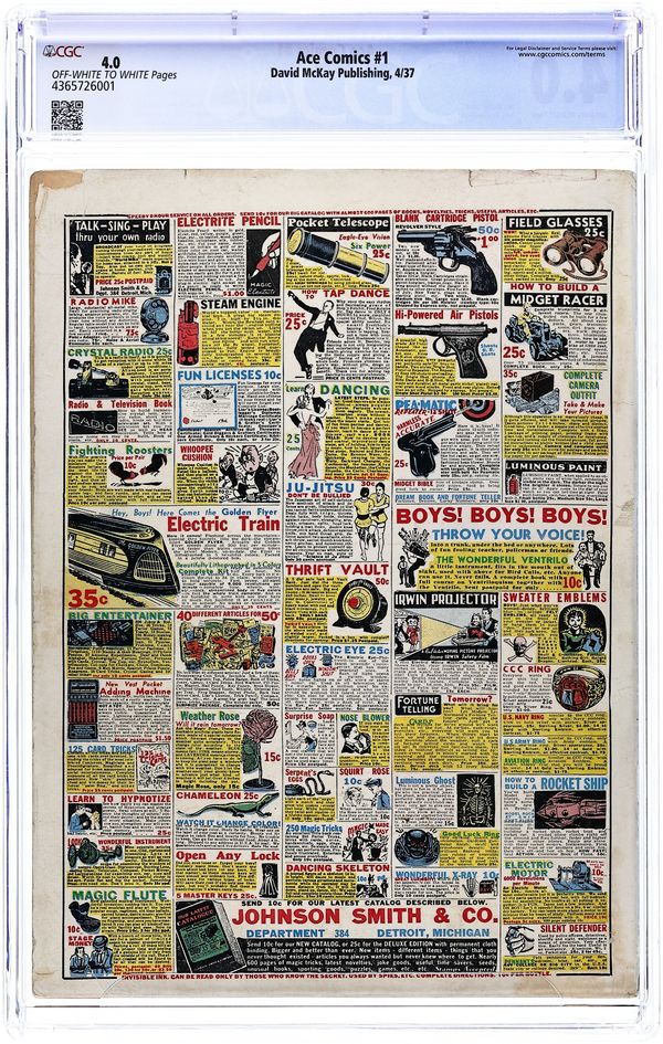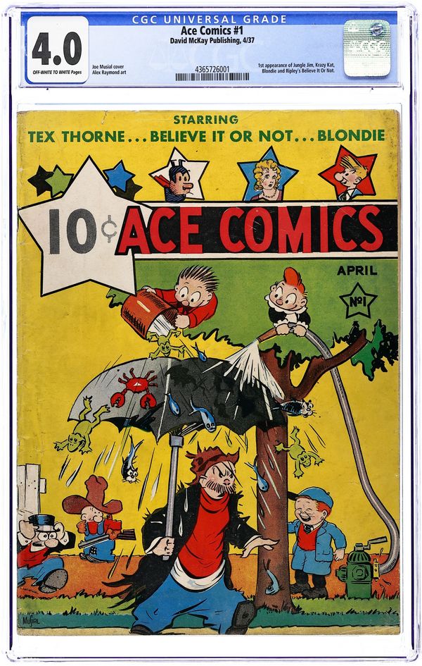 Cover by Joe Musial. Edited by Ruth Plumly Thompson. Stories and art by Robert L. Ripley, Feg Murray, Clarence D. Russell, H. H. Knerr, Ed Anthony, Doc Winner, Jack Sords, Russ Westover, A. D. Carter, Lyman Young, Nat Edson, Chic Young, Rutherford G. Montgomery, Jack King, Jack Welch, Joe Musial, Billy DeBeck, Romer Grey, Allen Dean, Paul Robinson, Gene Ahern, George Herriman, Don Moore and Alex Raymond. Pioneering comics publisher David McKay presents an anthology series featuring reprints of King Features Syndicate comic strips. Includes Alex Raymond's Jungle Jim and George Herriman's beloved Krazy Kat. The cover features Snuffy Smith and the Katzenjammer Kids interacting with lesser-known characters, like Elmer and Pete the Tramp. Tex Thorne; Ripley's Believe It Or Not; Jungle Jim; Seein' Stars; Pete the Tramp; Katzenjammer Kids; Pussycat Princess; Elmer; Sports in Pictures; Tillie the Toiler; Nicodemus O'Malley & His Whale, Palsy-Walsy; Dream Land; Just Kids; Tim Tyler's Luck; Blondie; Timberline Tales; The Stamp Spotlight; On Our Block; Curley Harper at Lakespur; Teddy and Sitting Bull; Barney Google; Etta Kett; Krazy Kat; Room and Board; Doc Winner's Daffy Doodles. 68 pages, Full Color. Cover price $0.10. Grade: CGC 4.0 explanation of grade Condition: Used (collectible)