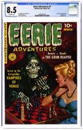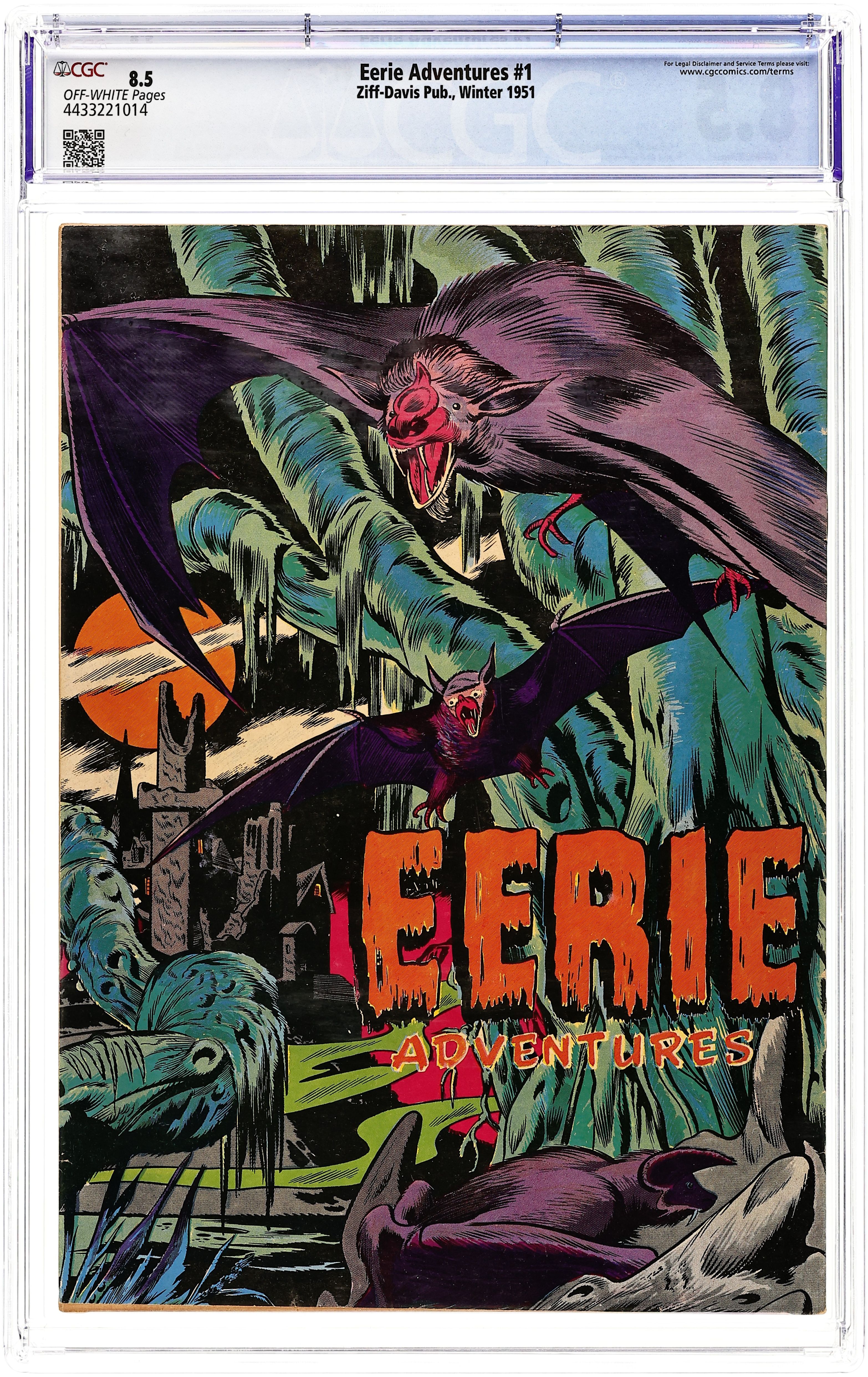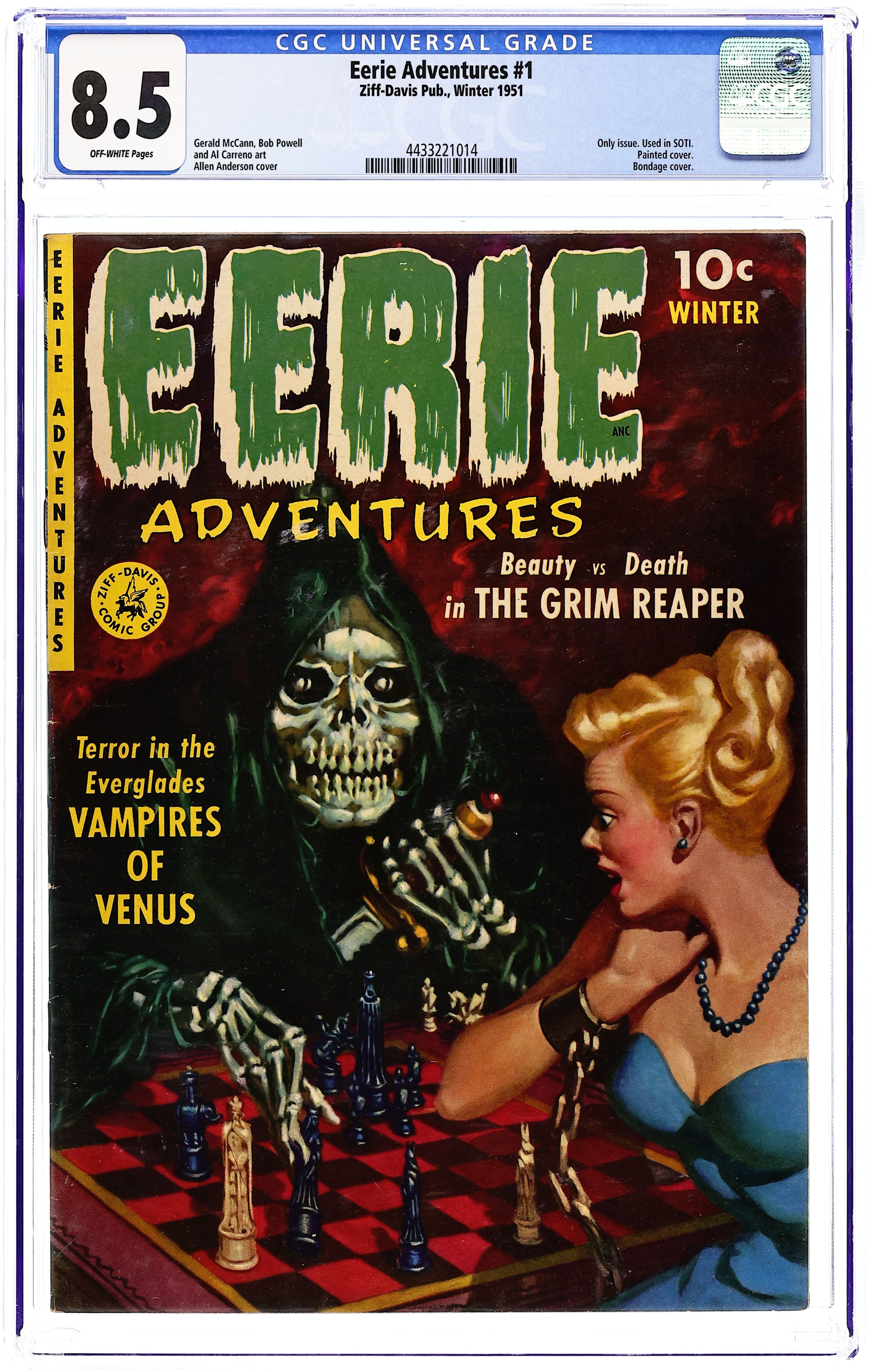 Painted cover by Allen Anderson. Stories and art by Bob Powell, Howard Nostrand, Al Carreno, and Gerald McCann. Ziff-Davis's pre-Code horror comic only lasted one issue before Avon took exception to their use of the title "Eerie." This comic was mentioned in the text (pp. 317-318) of Dr. Fredric Wertham's anti-comics classic Seduction of the Innocent. Two brothers rescue a stranded space traveler, who repays them by planting blood-sucking vines in their cellar. A criminal on the run kills a scientist and tries to escape into "the fourth dimension." A chess tournament becomes a game with Death. Plus one-pagers about various ghosts. Painted cover with bondage elements by Allen Anderson. Famous American Ghosts; The Vampires from Venus!; The Grim Reaper; The Fountain of Youth!; The Perfect Hideout!; Deadline for Death!; Preview of Death; From Beyond the Grave. 32 pages, Full Color. Cover price $0.10. Grade: CGC 8.5 explanation of grade Condition: Used (collectible)