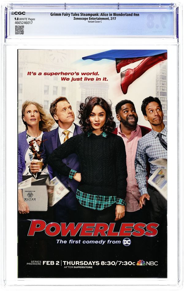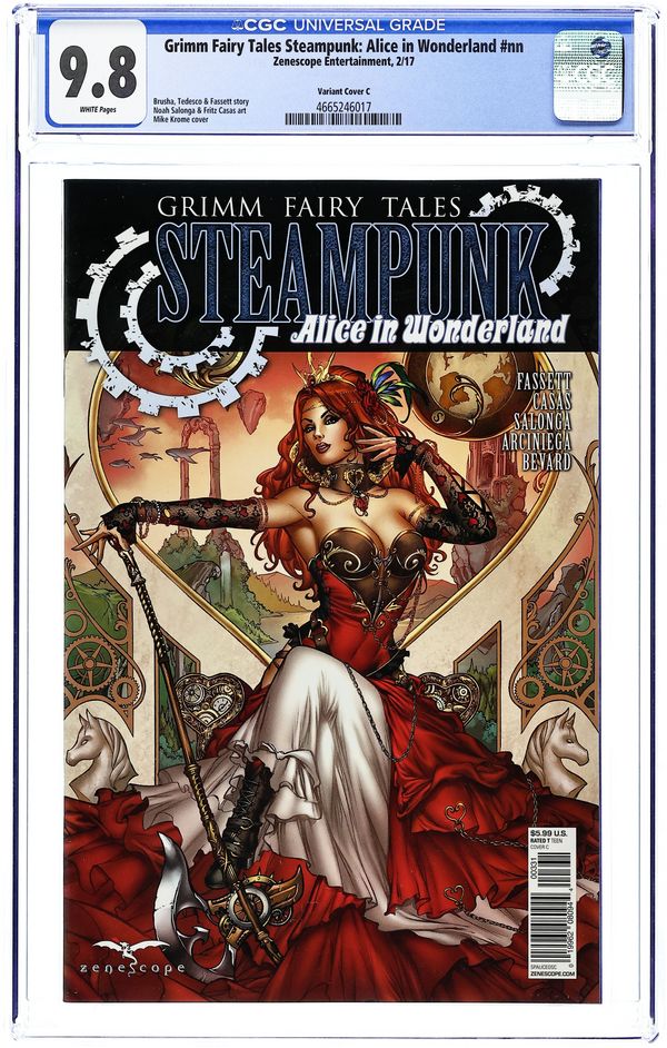 Written by Ryan Fasset. Art by Noah Salonga and Fritz Casas. Cover by Mike Krome. The Wonderland ongoing series may have ended but that isn't the end of Alice. An alternate dimension is emerging in the Grimm Universe and what better place to explore it could there be than by going through the looking glass. This new Alice in Wonderland tale expands on the story that began in the Grimm Fairy Tales Steampunk Mini-series. 40 pages, full color. Rated T Cover price $5.99. Grade: CGC 9.8 explanation of grade Condition: Used (collectible)