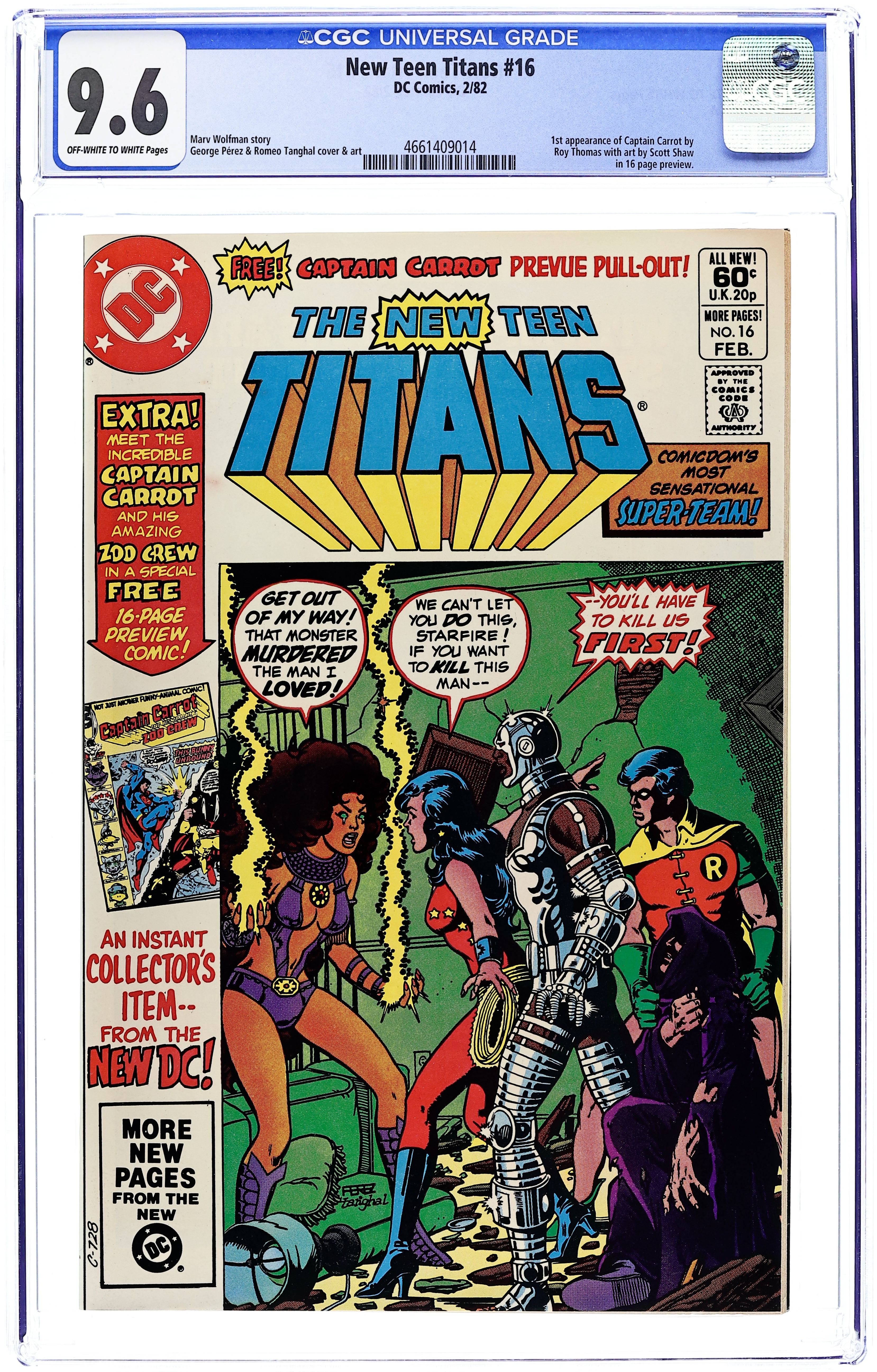 Direct Edition. Raven starts college, while Starfire's bubble is suddenly burst by the H.I.V.E. in "Starfire Unleashed!" Script by Marv Wolfman, pencils by George Perez, inks by Romeo Tanghal. 27 pages of story. Bonus 16-page tale: Superman encounters Captain Carrot and his Amazing Zoo Crew in "This Bunny Unbound!" Script by Roy Thomas, pencils by Scott Shaw! and Ross Andru, inks by Bob Smith. Perez/Tanghal cover. 1st appearance of Captain Carrot. Cover price $0.60. Grade: CGC 9.6 explanation of grade Condition: Used (collectible)