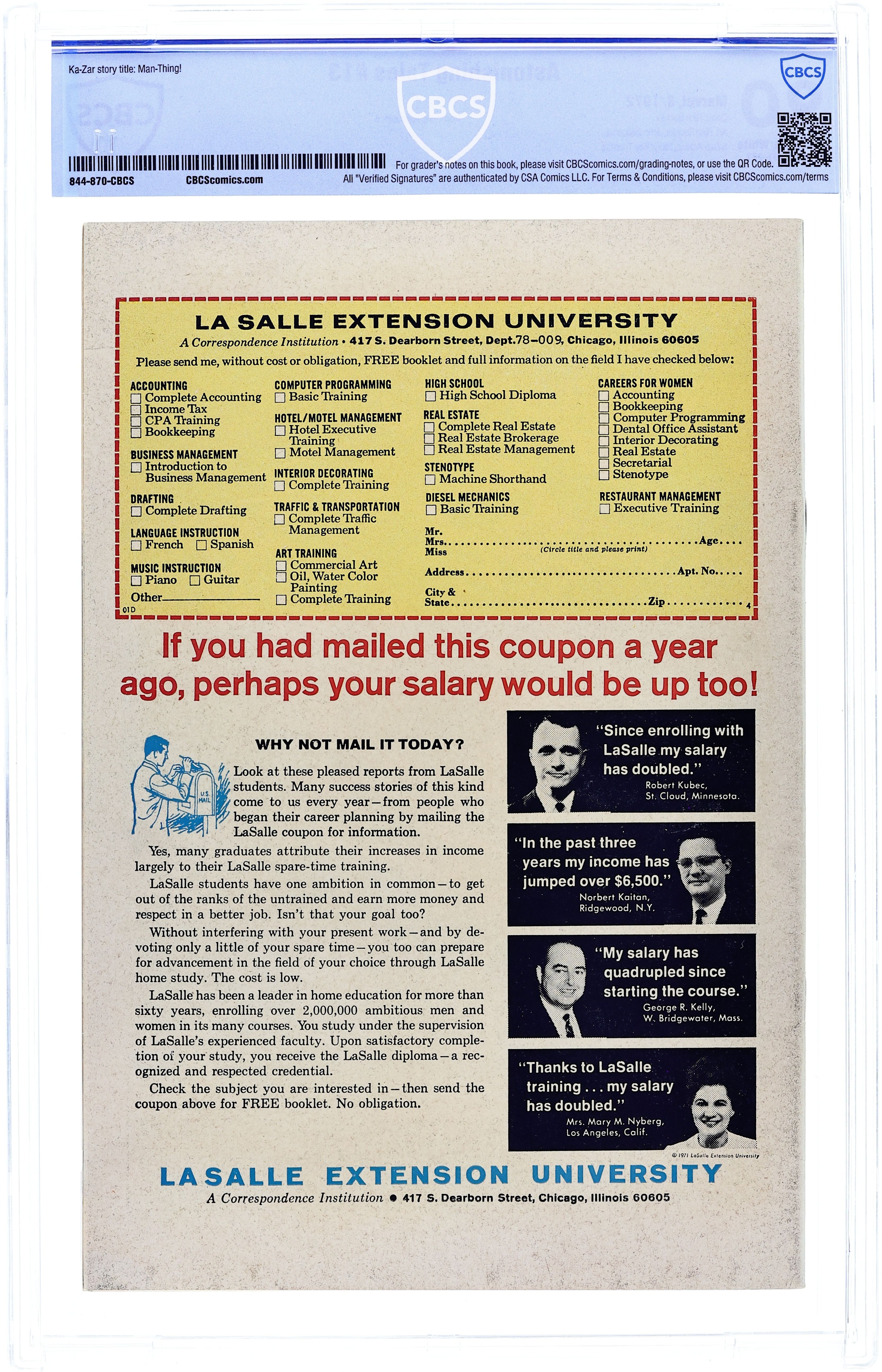 Starts Feb 2 Cover art by Rich Buckler. Man-Thing!, script by Roy Thomas, pencils by Rich Buckler (pages 1-6) and John Buscema (pages 7-20), inks by Dan Adkins; Ka-Zar (with the help of AIM) manages to capture the Man-Thing and he is transported to the lab; He escapes and follows Ka-Zar and Barbara Morris when they go searching for the kidnapped Dr. Calvin; They find and save Dr. Calvin but the traitorous Paul Allen is killed by the Man-Thing. 32 pgs. $0.20. Cover price $0.20. Grade: CBCS 9.0 explanation of grade Condition: Used (collectible)
