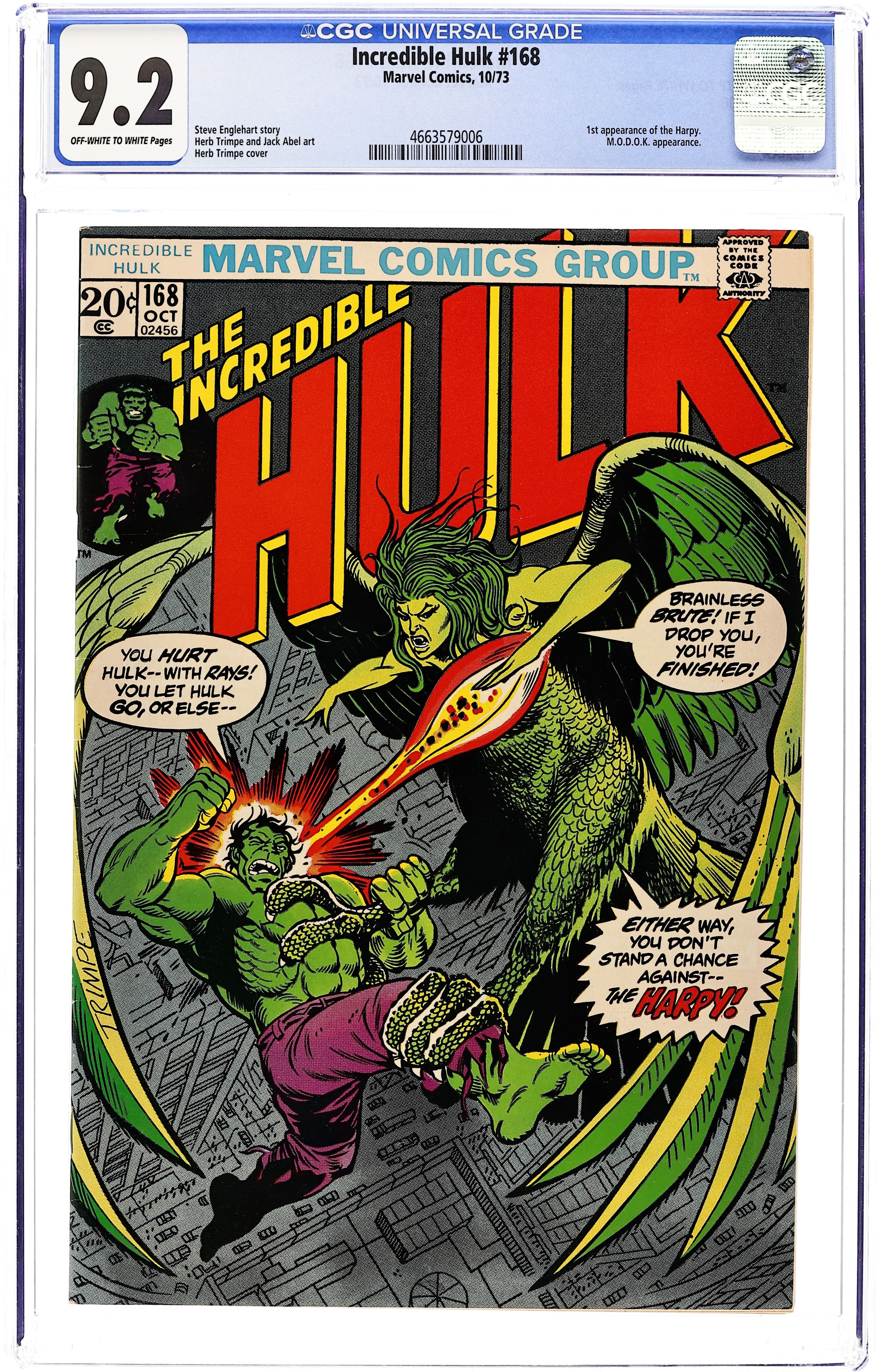 Cover art by Herb Trimpe. The Hate of the Harpy!, script by Steve Englehart, pencils by Herb Trimpe, inks by Jack Abel; M.O.D.O.K. exposes Betty to a heavy dose of gamma radiation and turns her into the Harpy; Lashing out at the jade giant for having a hand in her husband's death, the Harpy takes down the Hulk by playing on his sympathies and then blasting him; Meanwhile, officials at the Pentagon relieve Thunderbolt Ross of his duties and place Colonel Armbruster in charge of Project Greenskin. 36 pgs. $0.20. Cover price $0.20. Grade: CGC 9.2 explanation of grade Condition: Used (collectible)
