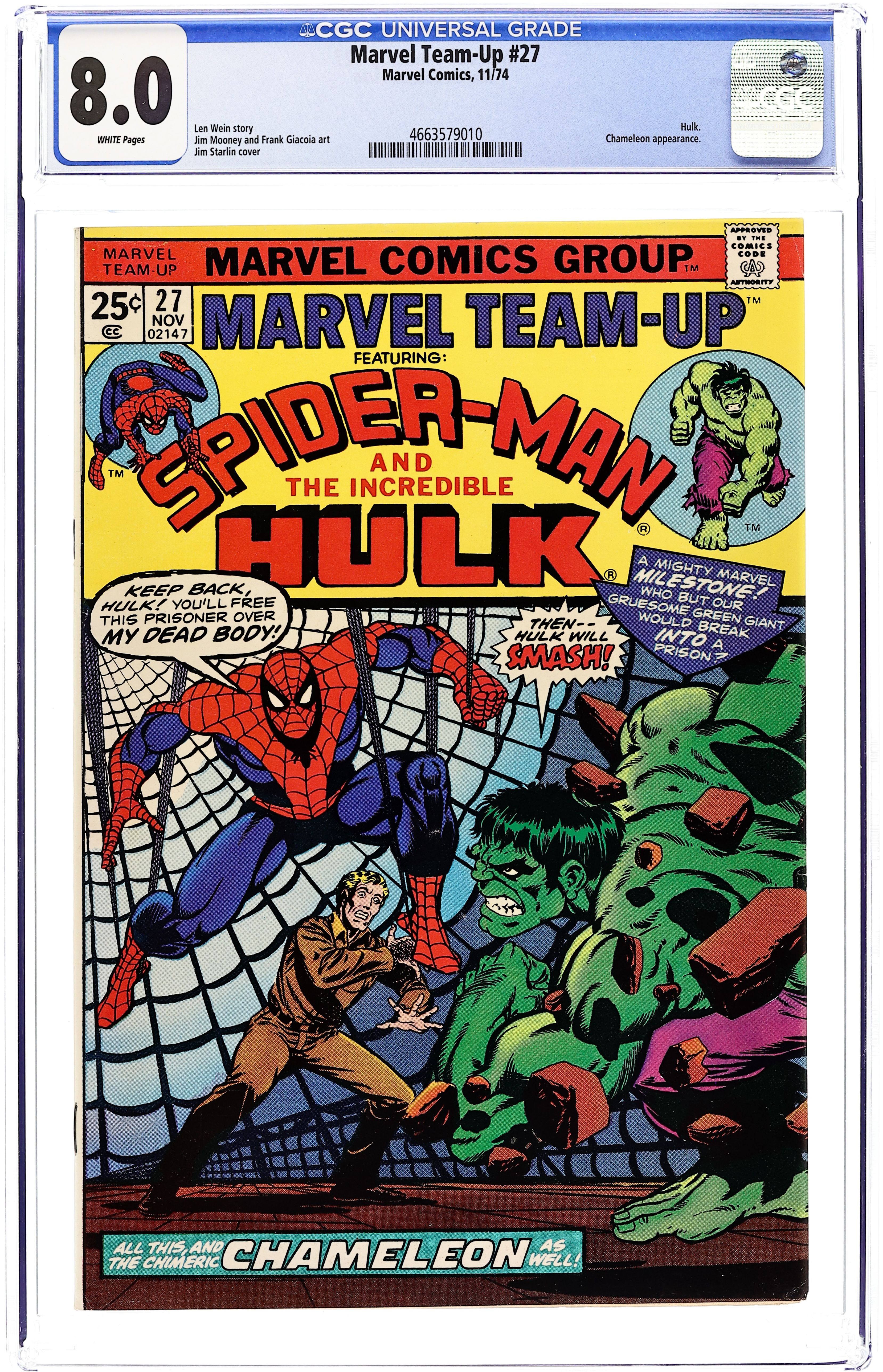 "A Friend in Need!" Guest-starring Spider-Man and the Hulk. Script by Len Wein. Pencils by Jim Mooney. Inks by Frank Giacoia and Dave Hunt. Cover by Jim Starlin. The crafty Chameleon tricks the Incredible Hulk into helping him break a friend out of prison! Can Spider-Man stop them? Cameo appearance by Ned Leeds. (Notes: This issue was reprinted in Marvel Treasury Edition 27. The letters page contains Marvel Value Stamp Series A #68 Son of Satan.) 36 pages Cover price $0.25. Grade: CGC 8.0 explanation of grade Condition: Used (collectible)