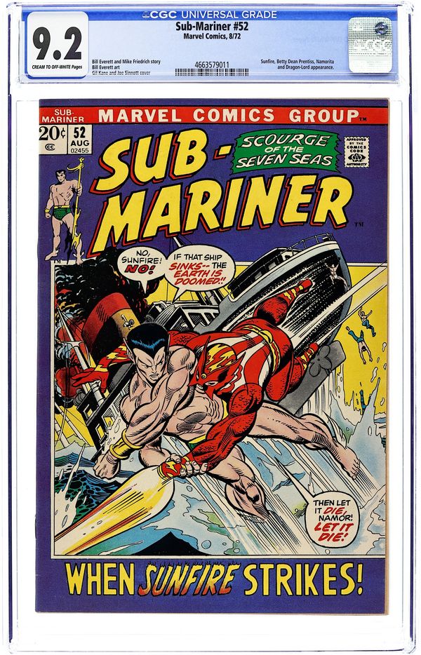 Cover pencils by Gil Kane, inks by Joe Sinnott. "Atomic Samurai," script by Bill Everett and Mike Friedrich, art by Bill Everett; Namor travels to the surface world with Namorita in search of Betty Dean who he hopes will serve as a guardian to the young Namorita; They track down Betty who is vacationing on the Japanese island of Krakinowa; Namor stumbles upon a hidden city controlled by the Dragon-Lord who is eager to bring about another war with the US; The Dragon-Lord sends his agent, Sunfire, off to capture a US freighter; Namor intercepts Sunfire as he's concerned that the destruction of the freighter could threaten the health of the seas; Despite Namor's best efforts, Sunfire strikes a deadly blow against the freighter and it begins to sink. 36 pgs., full color. $0.20. Cover price $0.20. Grade: CGC 9.2 explanation of grade Condition: Used (collectible)