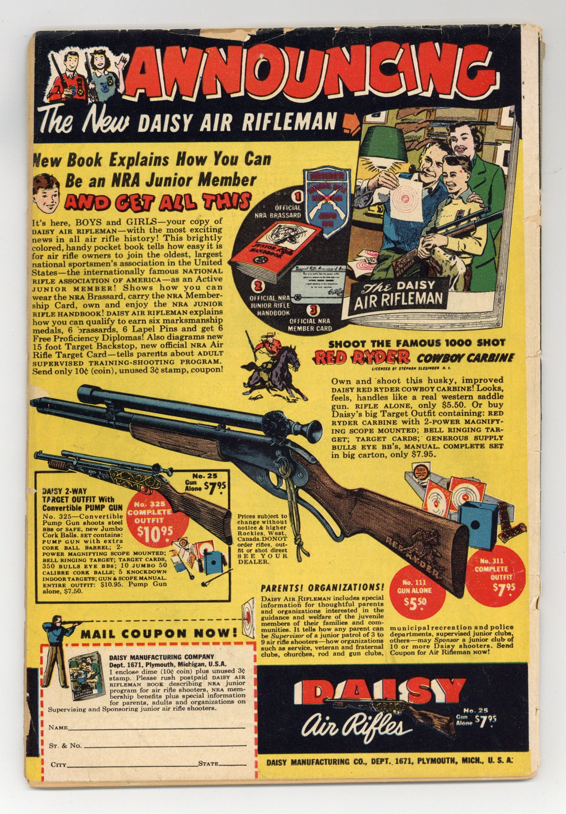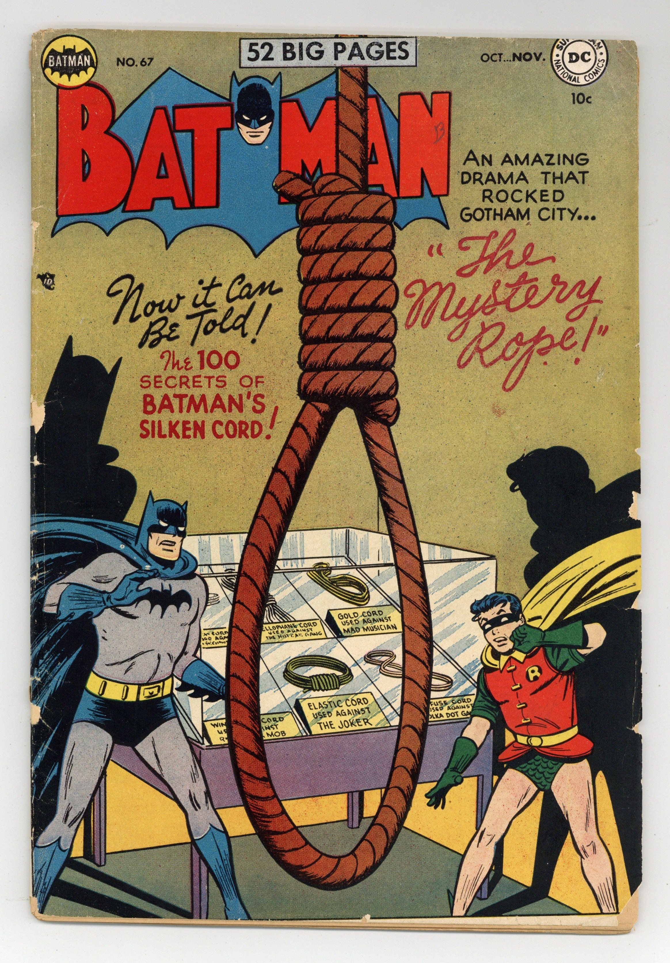 Cover by Win Mortimer. Lost--A Free Education public service announcement featuring Leave It to Binky, script by Jack Schiff, art by Bob Oksner. "The Mystery Rope!", script by David Vern, pencils by Bob Kane (Batman and Robin figures only) and Lew Sayre Schwartz, inks by Charles Paris; A criminal who is superstitious about the number seven escapes from prison; The Gotham Historical Society asks Batman to donate one of his Batropes. -page Private Pete story by Henry Boltinoff. "The Man Who Wrote the Joker's Jokes!", script by David Vern, pencils by Bob Kane (Batman and Robin figures only) and Lew Sayre Schwartz, inks by Charles Paris; The Joker decides hires gag writers to invient crime ideas that would make fools of Batman and Robin; Joker kidnaps Robin and forces Batman to write a plan for him. The Kings of Sport article by Barbara Fairbanks (as F. Banks), art by Raymond Perry. "The Lost Legion of Space," script by Bill Finger, pencils by Dick Sprang, inks by Charles Paris; Inspired by archival footage of the original Dynamic Duo, Brane Taylor and his nephew adopt their identities in the year 3051; The new Robin soon breaks his leg while fighting the henchmen of the evil Yerka. One-page Jerry the Jitterbug story by Henry Boltinoff. 52 Pages, Full Color. Cover price $0.10. Grade: GD+ 2.5 explanation of grade Condition: Used (collectible)