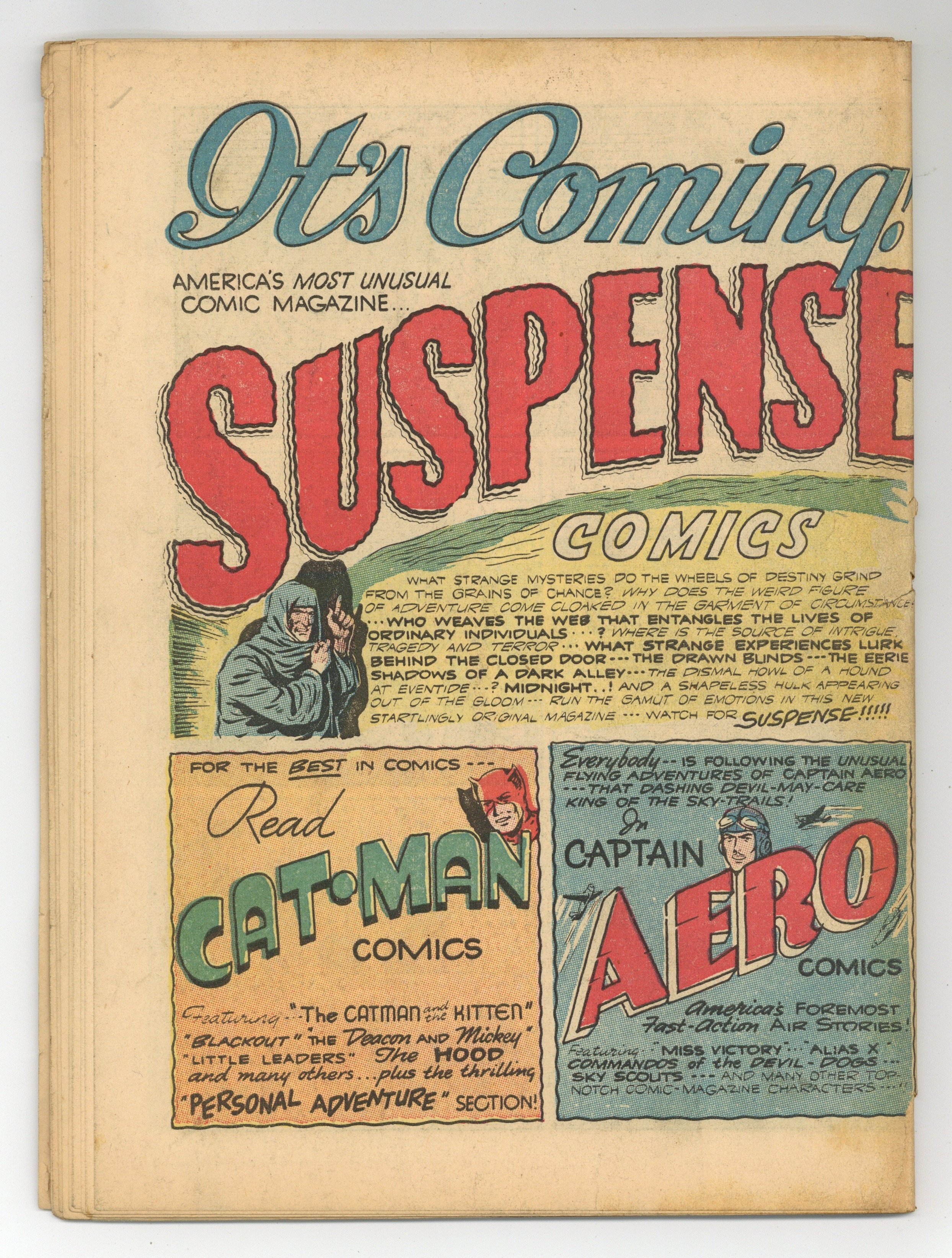 Cover by Charles Quinlan. Stories and art by Charles Quinlan, Herman C. Browner, Jack Grogan, Jack Alderman, and C. R. Schaare. Sometimes listed as Cat-Man Comics Vol. 2 #8. The adventures of Cat-Man and other early superheroes from the Golden Age of comics. Cat-Man and Kitten battle their arch-enemy, the porcine Mr. Peccary, after he escapes prison. The Deacon goes after black marketers who deal in ration books, designed to conserve national resources during World War II. American soldiers in Nazi-occupied Europe encounter Blackout, leader of the Berlin underground, and learn the secret of the old windmill. Cat-Man & Kitten; The Deacon: The Ration Book Racket; Ragman; Little Leaders; The Hood: The Mystery Sharks Nest Point; In Twenty-Five Years; Blackout: The Windmill of Betrayal!; Murders for Profit; Los Banditos; Black Market Butcher; Death Roams the Deep. 60 pages, Full Color. Cover price $0.10. Grade: Coverless explanation of grade Condition: Used (collectible)