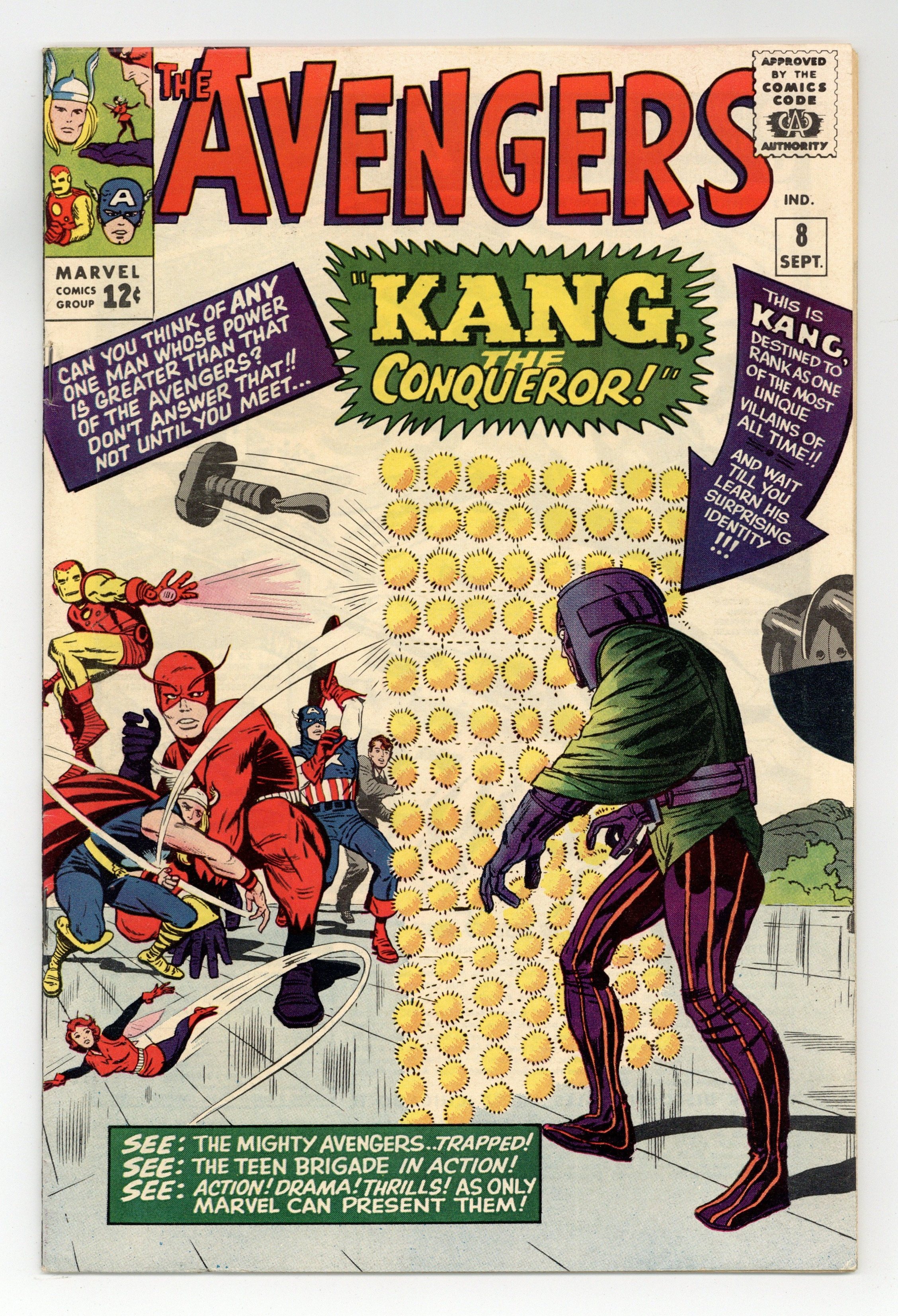 Cover pencils by Jack Kirby, inks by Dick Ayers. Kang, The Conqueror!, script by Stan Lee, pencils by Jack Kirby, inks by Vince Colletta cover; Kang appears and demands to be made ruler of the Earth; The Avengers attempt to stop him, but it comes down to Wasp and the Teen Brigade to slow Kang long enough for the rest of the Avengers to free themselves and put an end to Kang's threat. Roster: Captain America, Thor, Iron Man, Wasp, Giant-Man, and Rick Jones. First appearance of Kang. 36 pgs. $0.12. Cover price $0.12. Grade: VG+ 4.5 explanation of grade Condition: Used (collectible)