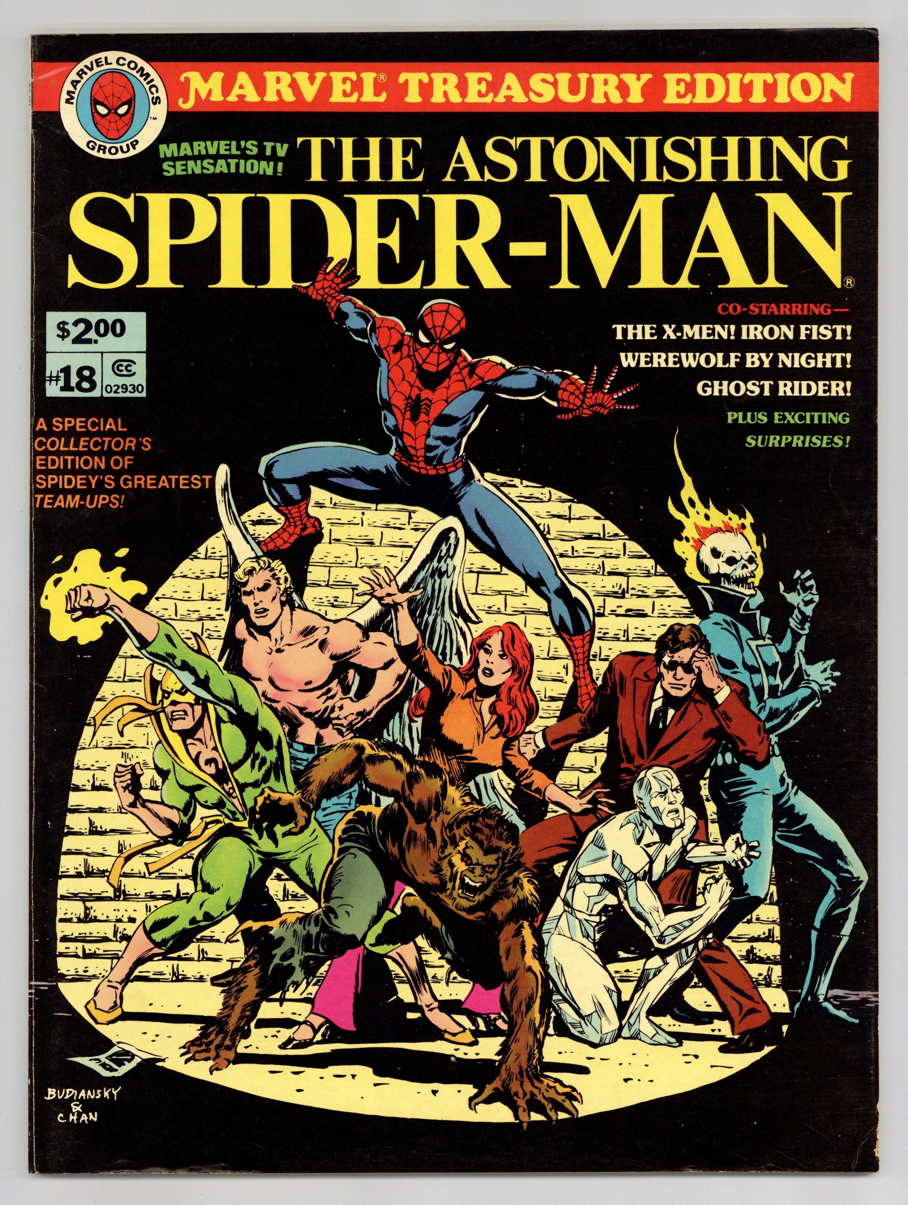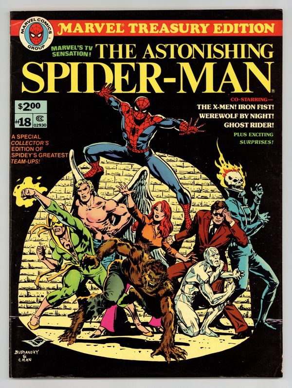 Starts Feb 2 Marvel Edition. Marvel Treasury Edition (1974) #18 features Marvel's TV sensation the Astonishing Spider-Man. This issue features some of Spidey's greatest team-ups including "And then, the X-Men" (Reprints Marvel Team-Up #4) by Gerry Conway, Gil Kane, and Steve Mitchell, "Wolf at Bay" (Reprints Marvel Team-Up #12) by Len Wein, Gerry Conway, Ross Andru, and Don Perlin, "If an Eye Offend thee..." (Reprints Marvel Team-Up #15) by Len Wein, Ross Andru, and Don Perlin, "For a Few Fists More" (Reprints Marvel Team-Up #31) by Gerry Conway, Jim Mooney, and Vince Colletta. Guest-starring the original X-Men, Werewolf by Night, Ghost Rider, and Iron Fist and featuring the villainy of Morbius the Living Vampire and the Orb. 80 pages. Cover price $2.00. Grade: FN/VF 7.0 explanation of grade Condition: Used (collectible)