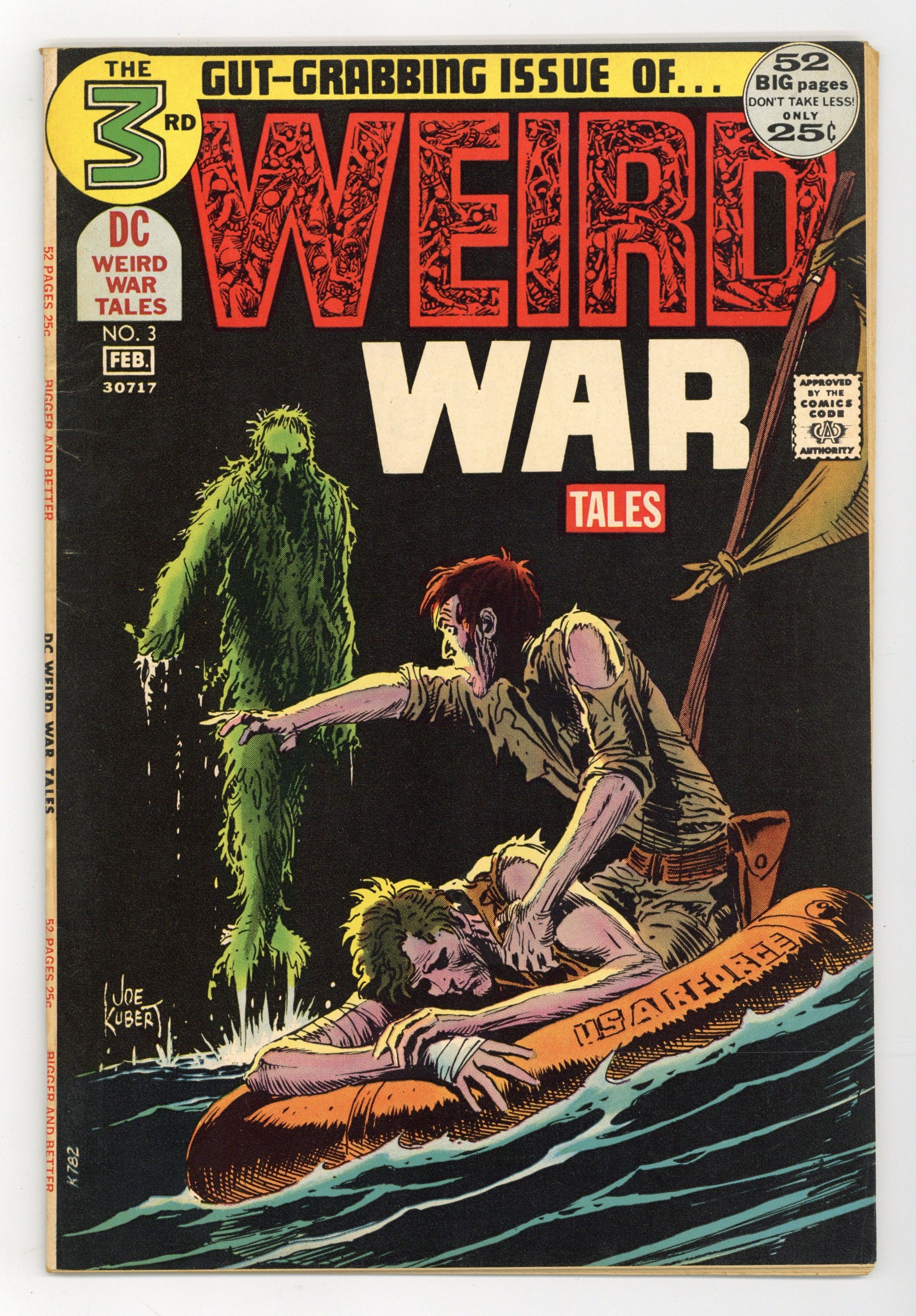 Cover art by Joe Kubert. Framing sequence by Kubert. Been Here Before!, script by Bill Finger, pencils by Ross Andru, inks by Mike Esposito. The Cloud That Went to War!, script by Dave Wood, pencils by Ross Andru, inks by Mike Esposito. The Kreepy Korps!, script and art by John Costanza. The Pool..., script by Len Wein and Marv Wolfman, art by Russ Heath. Combat Size!, script by Bob Haney, art by Russ Heath. Behind the Lines text story. Flying Guns--Battle Album, script and art by Sam Glanzman. Pilot for a Sub!, script by Bill Finger, art by Mort Drucker. Lifeboat, script and art by Joe Kubert. 52 pgs. $0.25. Cover price $0.25. Grade: VG+ 4.5 explanation of grade Condition: Used (collectible)