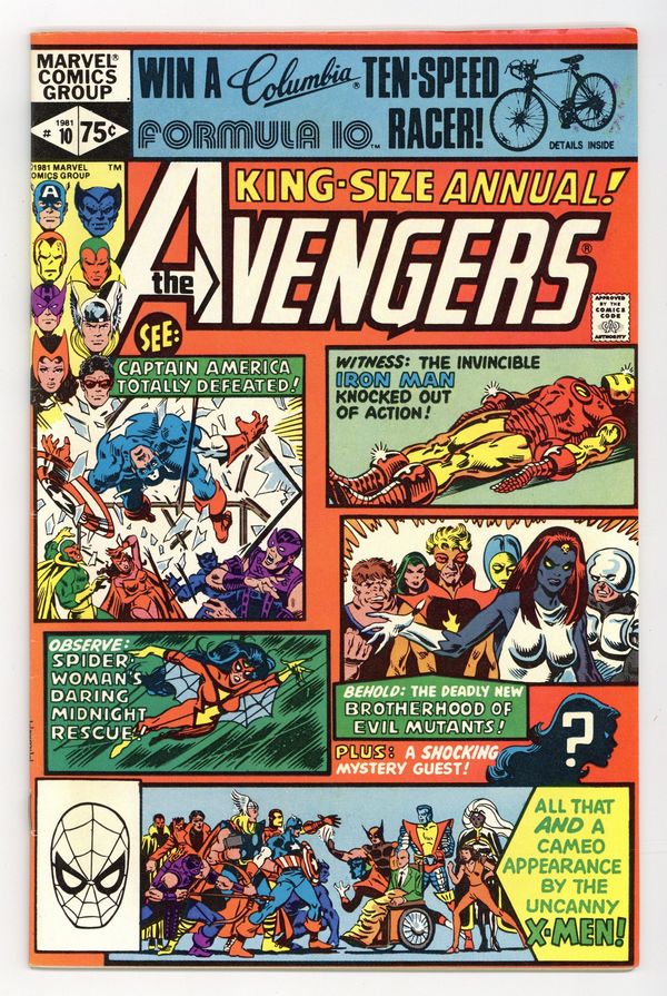 Starts Jan 26 Direct Edition. First appearance of Rogue and Madelyne Pryor in "By My Friends Betrayed!" Spider-Woman, X-Men, Carol Danvers, and New Brotherhood of Mutants guest star. Script by Chris Claremont. Pencils by Michael Golden. Inks by Armando Gil. Cover by Al Milgrom. This action-packed annual has got it all, true believers: the first appearance of Rogue, the spectacular art of Michael Golden, the tragic return of Carol Danvers, and the stupendous struggle between the Brotherhood of Evil Mutants and the mighty Avengers! Following the events of Uncanny X-Men #142, Mystique & her New Brotherhood of Evil Mutants attempt to break four of their members out of Ryker's Island prison! After Rogue and Mystique take down Captain America, Iron Man, and Thor, the rest of the Avengers and Spider-Woman catch up to the villains, and the epic clash erupts! Woven in and around the frantic action at Ryker's Island is the heartbreaking story of Carol Danvers' return to Earth. Her life has fallen apart since leaving for Limbo with Marcus Immortus in Avengers #200, and now, stripped of her powers and memories, Carol begins the long road to recovery. And the first step is an emotional confrontation with her former teammates! Notes: Marvel Super-Heroes #11 (Fall 1992) fills in the details of Carol Danvers' life between Avengers #200 and Avengers Annual #10. The Thing stars in a one-page Hostess ad, "A Lesson to Be Learned!" This issue was reprinted in 1993 in the trade paperback: The Greatest Battles of the Avengers. 52 pages, full color. Cover price $0.75. Grade: FN+ 6.5 explanation of grade Condition: Used (collectible)