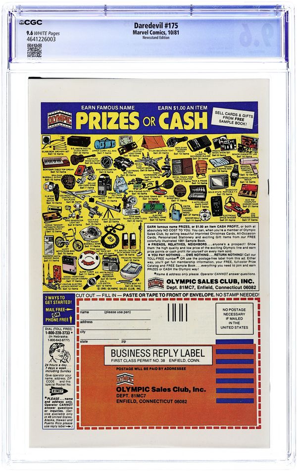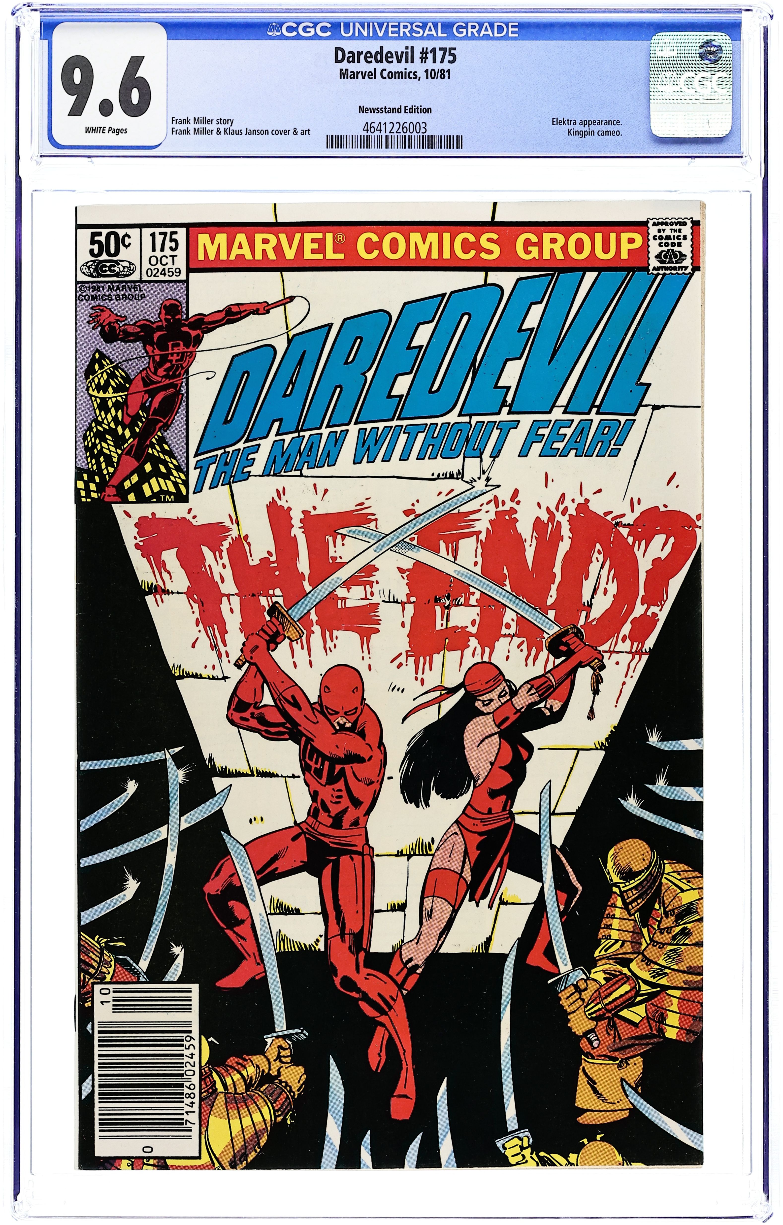 Newsstand Edition. Cover pencils by Frank Miller, inks by Klaus Janson. Gantlet, script by Frank Miller, pencils by Frank Miller (breakdowns) and Klaus Janson (finished art), inks by Klaus Janson; DD is without his radar sense and teamed-up with Elektra against the Hand and their master assassin, Kirigi; While Matt is off fighting ninja, Foggy is defending the Gladiator in court. Full page pin-up ad for Spider-Woman, pencils by Denys Cowan, inks by Al Milgrom. 36 pgs. Cover price $0.50. Cover price $0.50. Grade: CGC 9.6 explanation of grade Condition: Used (collectible)