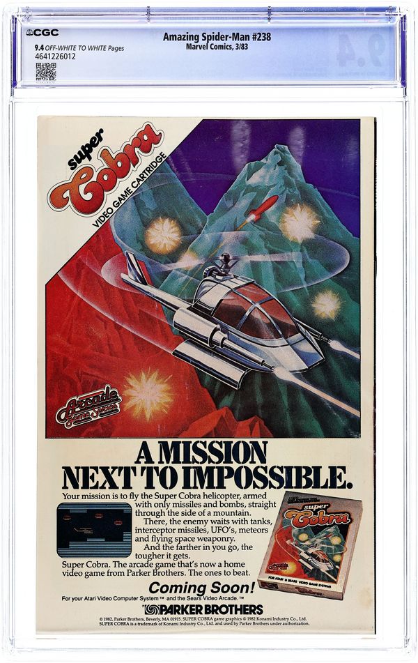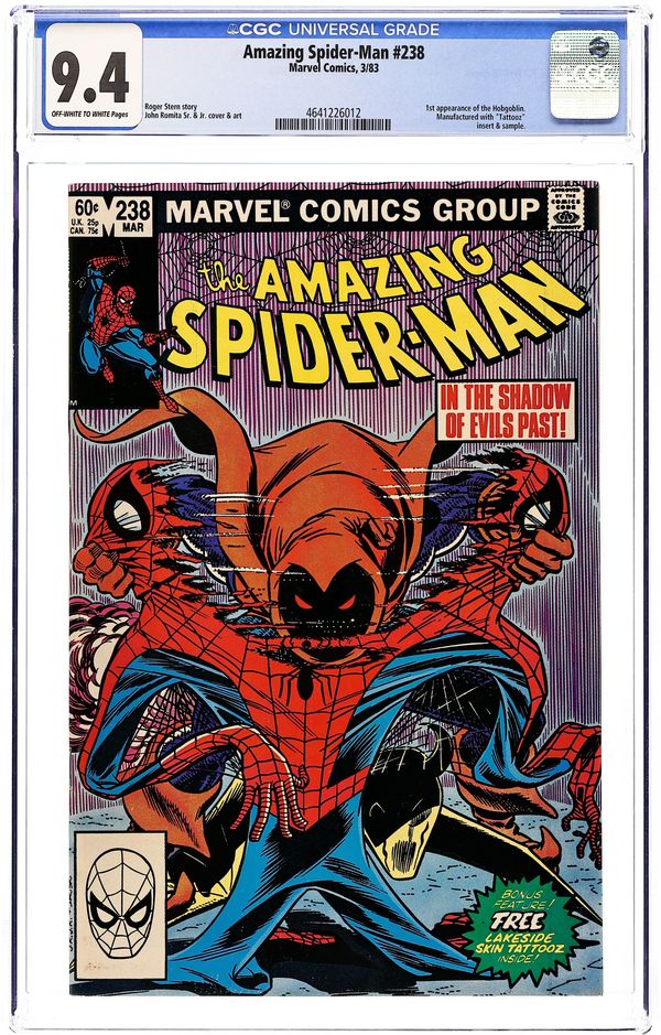 Starts Feb 2 IMPORTANT: Issue 238A HAS the Lakeside Skin Tattooz insert. Direct Edition. First appearance of the Hobgoblin in "Shadow of Evils Past!" Script by Roger Stern. Art by John Romita Jr. (breakdowns) and John Romita Sr. (finishes). Cover by John Romita Jr. and John Romita Sr. One of the landmark issues of the Amazing Spider-Man! And the beginning of the long secret identity mystery of the Hobgoblin! After escaping from the web-slinger, a bank robber stumbles upon an underground hideout of the (deceased) Green Goblin! Not knowing what to do with his discovery, the small-time hood shows the secret lair to an underworld associate! Unfortunately for the wondrous wall-crawler, the devious associate knows exactly what to do: resurrect the Green Goblin...with a twist! And a short time later a new super-villain is born! The Hobgoblin! Cameo appearance by Mary Jane Watson. Flashback cameo by Norman Osborn (aka the Green Goblin). (Notes: The secret identity of the original Hobgoblin takes many twists and turns over the next decade. Who actually operates as the Hobgoblin in this issue is revealed in the Spider-Man: Hobgoblin Lives (1997) Limited Series (written by Roger Stern). This issue was reprinted in Marvel Tales 257 and also in the 1992 trade paperback: the Amazing Spider-Man -- Origin of the Hobgoblin.) 36 pages. Cover price $0.60. Grade: CGC 9.4 explanation of grade Condition: Used (collectible)