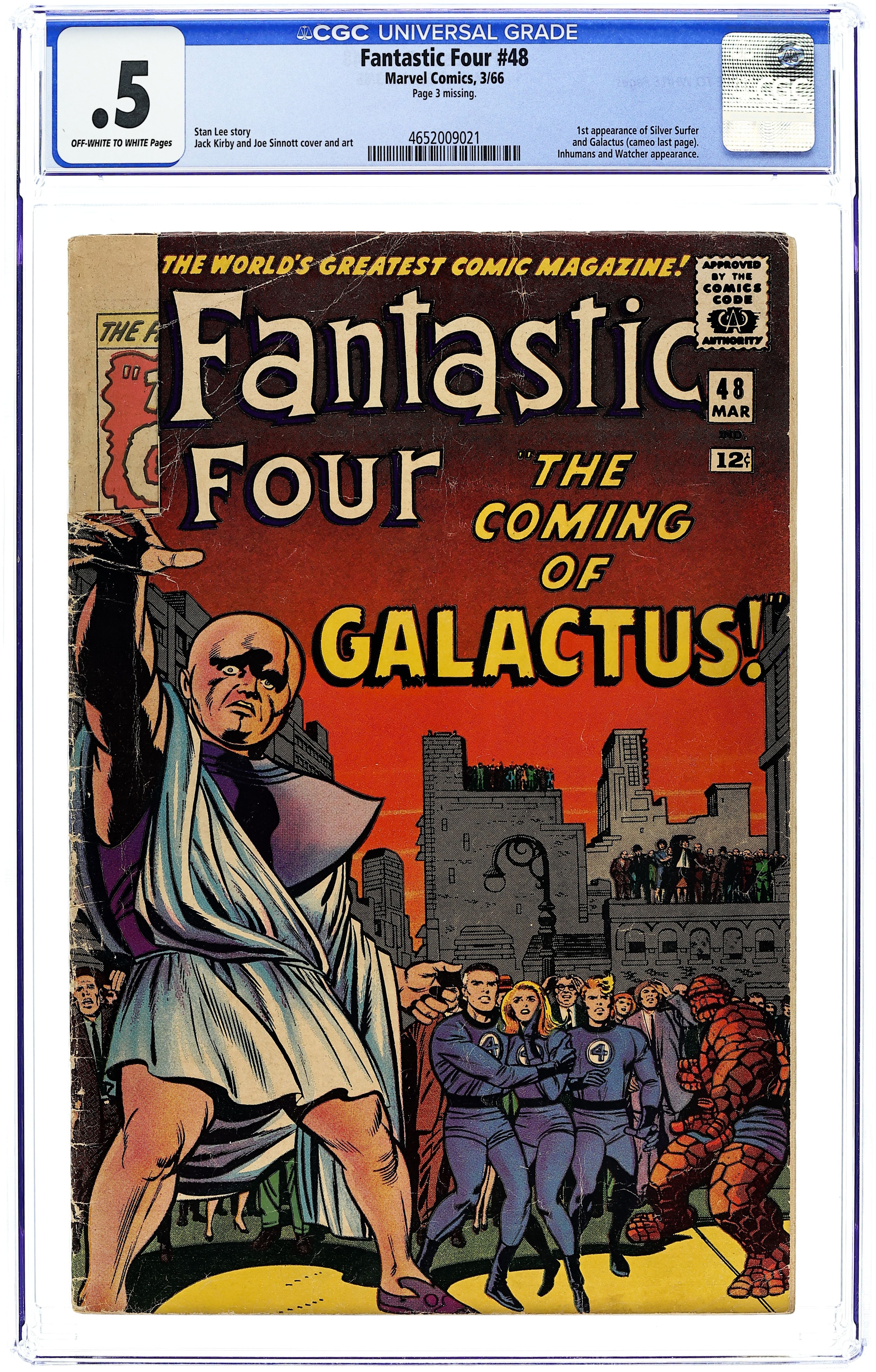 Starts Apr 4 Cover pencils by Jack Kirby, inks by Joe Sinnott. First appearance of Galactus and the Silver Surfer in one of the most famous stories of the Silver Age, The Coming of Galactus!, script by Stan Lee, pencils by Jack Kirby, inks by Joe Sinnott; Black Bolt and the Fantastic Four put an end to Maximus's plan to destroy all the humans; Once the Fantastic Four return to New York the Watcher tells them of the coming danger of Galactus. Letter to the editor from comics writer Don McGregor. 36 pages, full color. Cover price $0.12. Grade: CGC 0.5 explanation of grade Condition: Used (collectible)