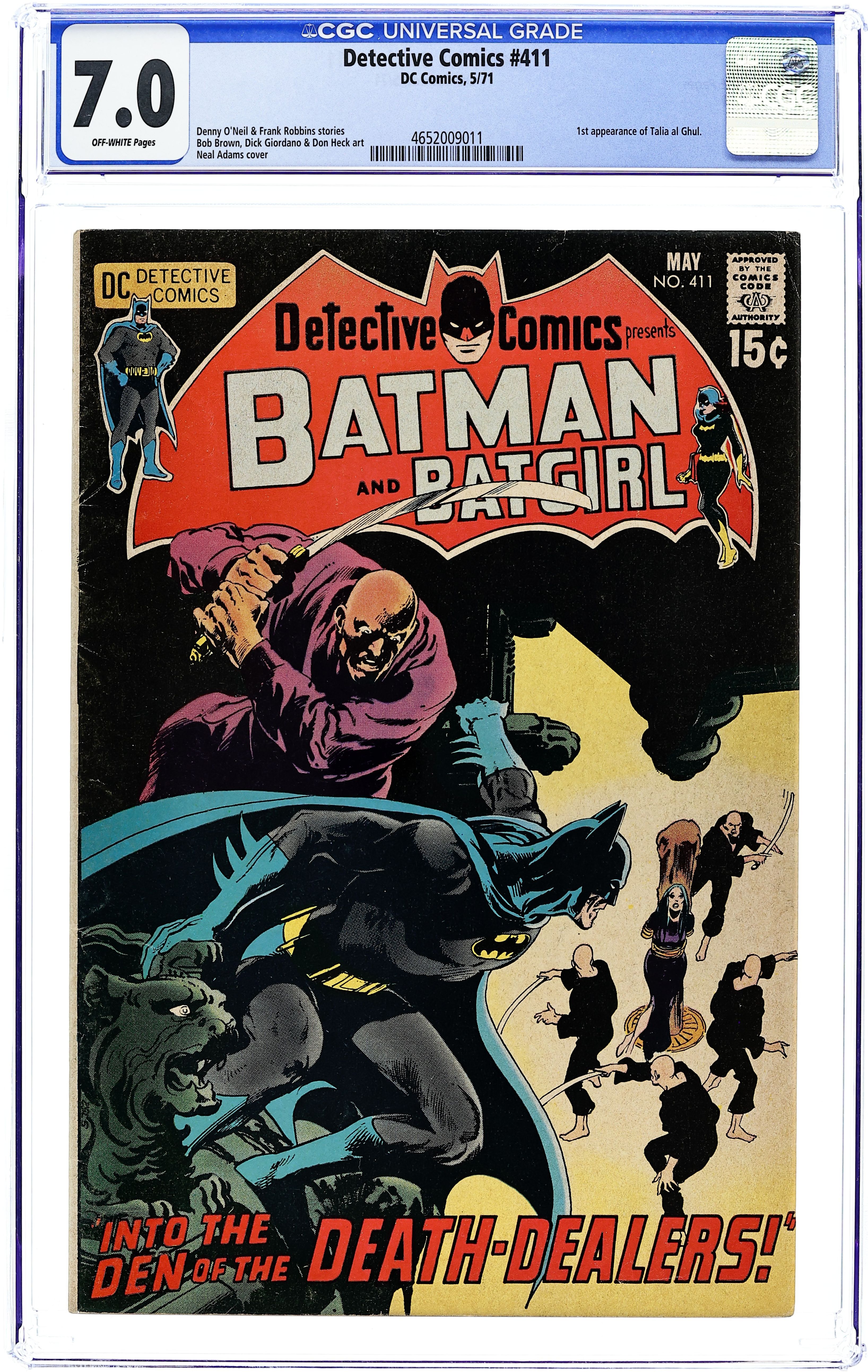 Starts Apr 4 Cover by Neal Adams. Ra's Al Ghul and the first appearance of his daughter, Talia, in "Into the Den of the Death-Dealers!," script by Denny O'Neil, pencils by Bob Brown, inks by Dick Giordano; Batman scales the side of Gotham's Statue of Freedom for a secret meeting with an informant inside the torch; The informant wants police protection in exchange for turning over evidence on Doctor Darrk and the League of Assassins; Before the criminal can reveal anything however, an assassin sneaks into the chamber and stabs him from behind. "Cut... and Run!," script by Frank Robbins, pencils by Don Heck, inks by Dick Giordano; Continuing from last issue, Batgirl has stumbled upon criminal activity involving the latest fashion sensation of the worlds greatest fashion model Mamie Archeson, a discovery that has her strapped onto a fabric cutter by the crook known as Serpy. Letter of comment from letter hack Guy Lillian. 36 pgs., full color. $0.15. Cover price $0.15. Grade: CGC 7.0 explanation of grade Condition: Used (collectible)