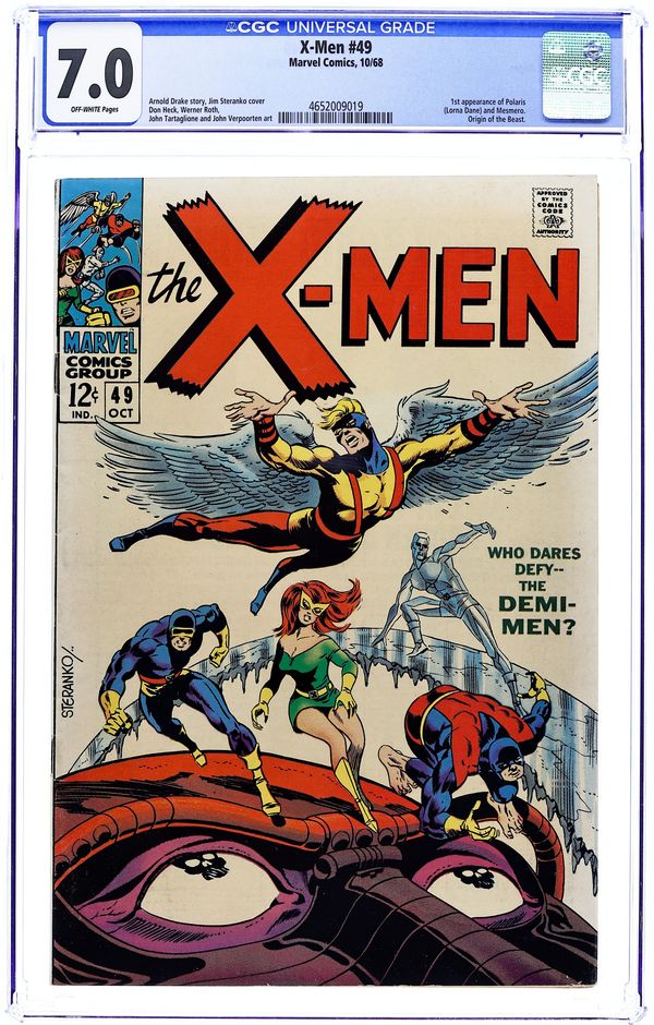 First appearance of Lorna Dane (Polaris). Cover art by Jim Steranko. Who Dares Defy the Demi-Men?, script by Arnold Drake, pencils by Don Heck and Werner Roth, inks by John Tartaglione; Angel warns Jean about Cerebro beeping loudly, and she tells the other X-Men; a group commanded by Mesmero uses a machine (along with his powers) to turn latent mutants into full-fledged mutants in order to form his army; 1st appearance of Mesmero. A Beast Is Born--The Origins of the Uncanny X-Men, script by Arnold Drake, art by Werner Roth; how Beast got his powers. Letter to the editor from comic writer Tony Isabella. 36 pgs. $0.12. Cover price $0.12. Grade: CGC 7.0 explanation of grade Condition: Used (collectible)